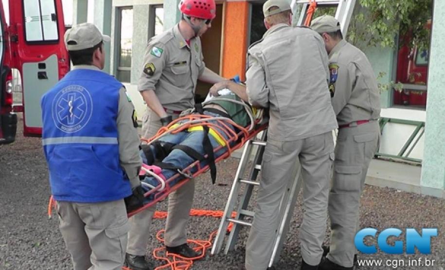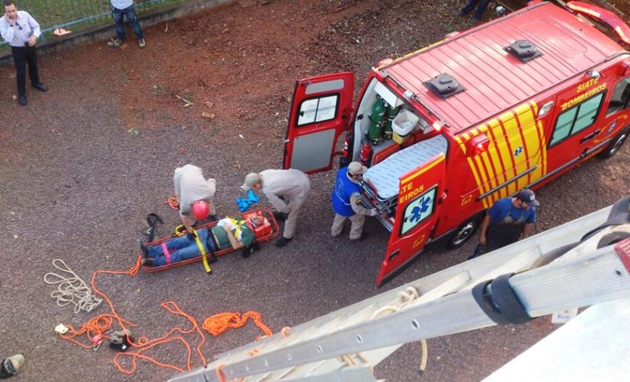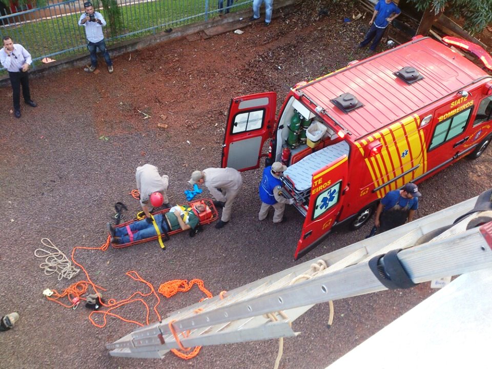 A situação mais complexa atendida pelo Corpo de Bombeiros de Cascavel na tarde de ontem, foi o atendimento de um trabalhador que realizava um serviço de pintura em uma edificação comercial e veio a cair de uma altura aproximada de dois metros ficando preso na cobertura.
