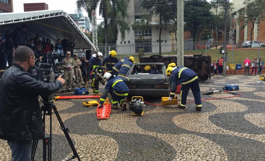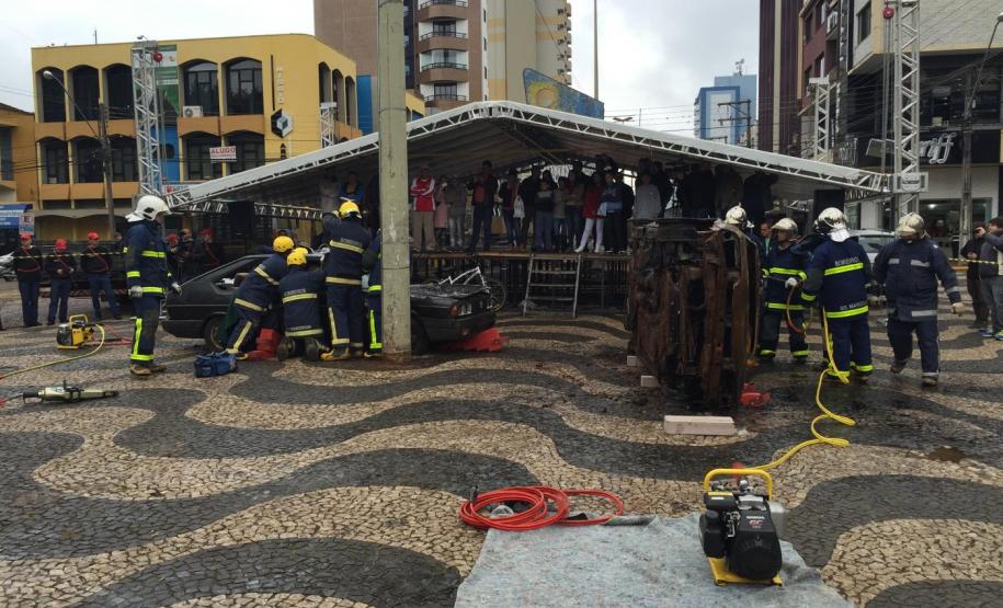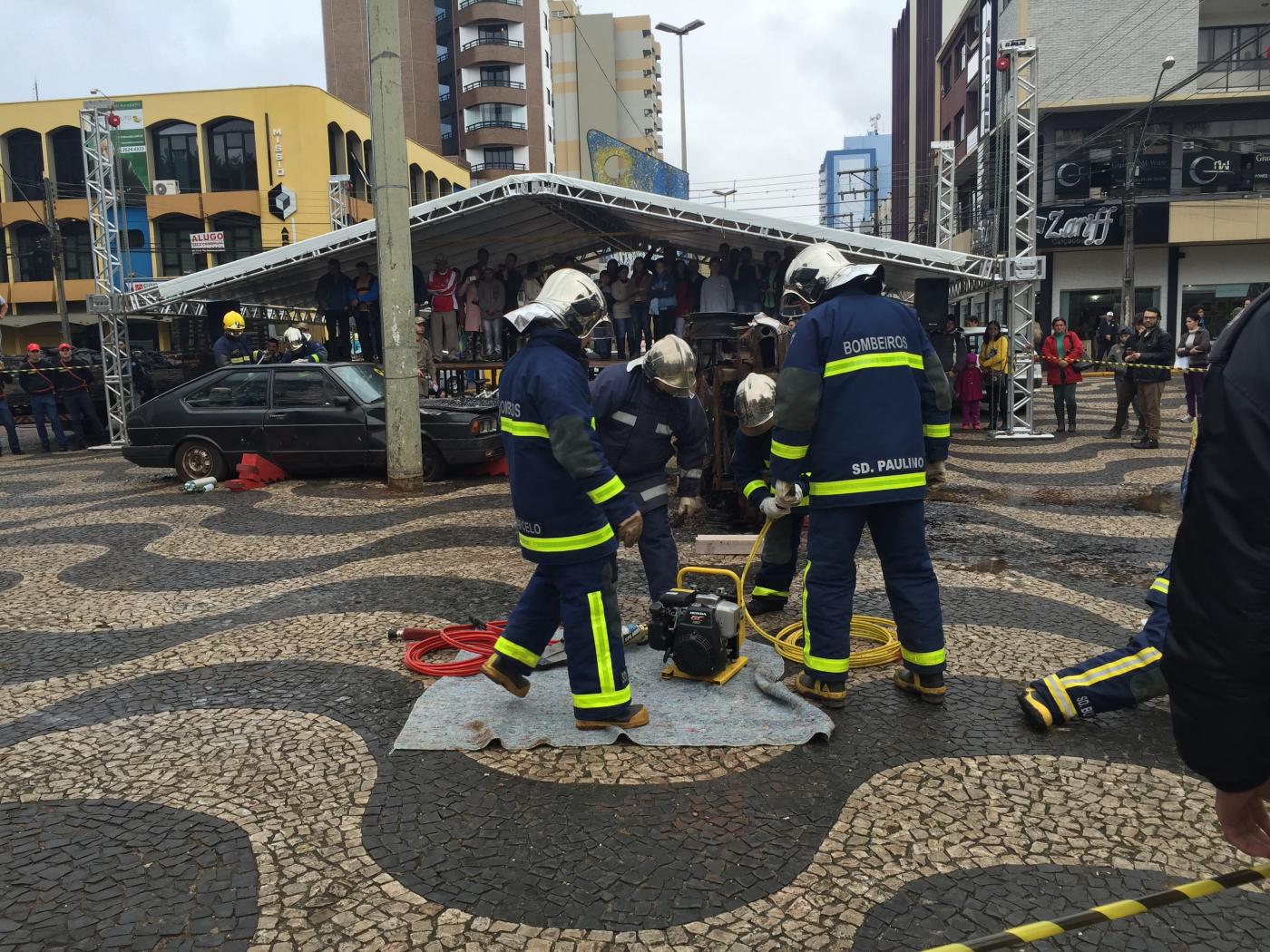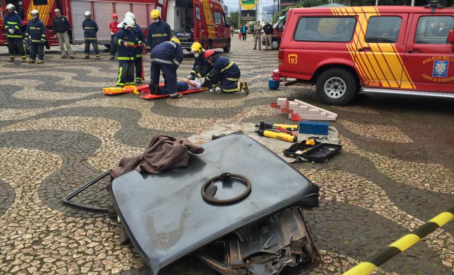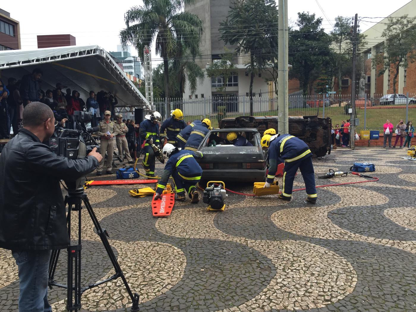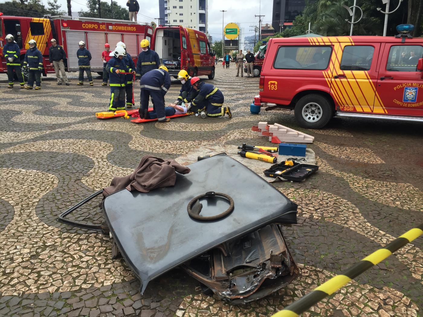 Durante o terceiro dia do estágio foi realizado um exercício simulado na praça central da cidade de Francisco Beltrão com a participação dos alunos do estágio. Atuando em uma situação hipotética de colisão auto-auto, com cinco vítimas envolvidas, as equipes de desdobraram para atender à ocorrência com rapidez e emprego das técnicas, utilizando os conhecimentos adquiridos durante os dias de treinamento.