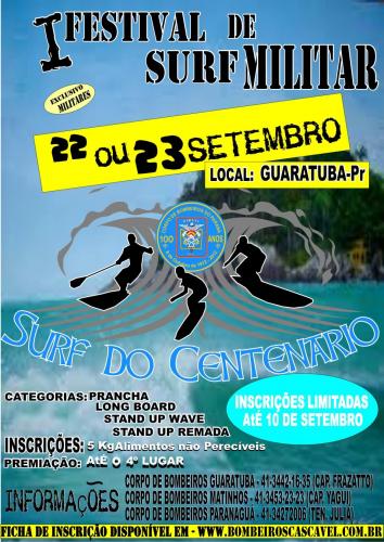 O surf do centenário, primeiro festival de surf destinado a militares ativos e inativos, será realizado no dia 22 ou 23 do próximo mês, de acordo com a ondulação do mar. O evento terá como sede Guaratuba e possui vagas limitadas.