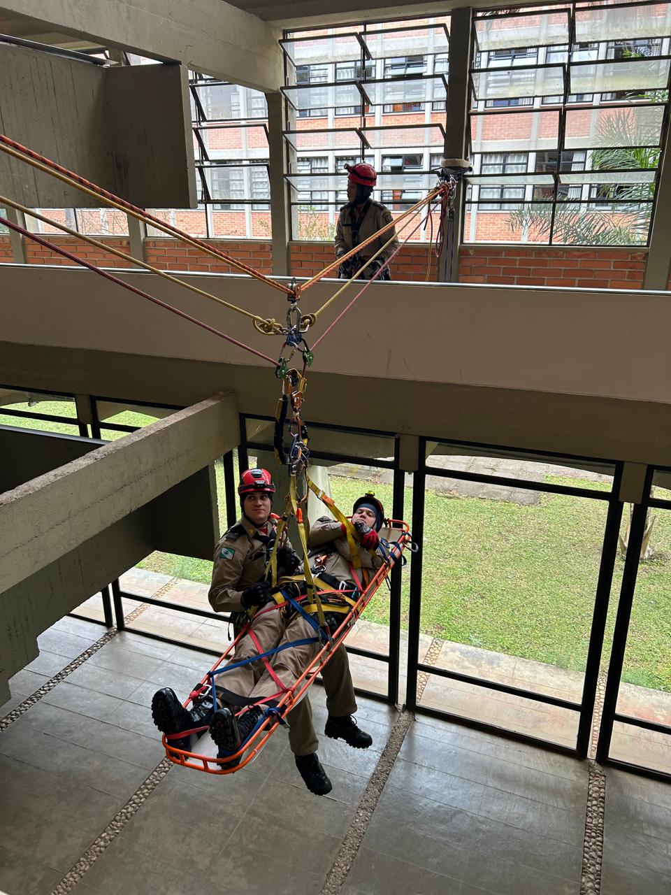 - Tirolesas: Técnicas avançadas de tirolesa foram ensinadas para transpor grandes vãos e obstáculos com vítimas