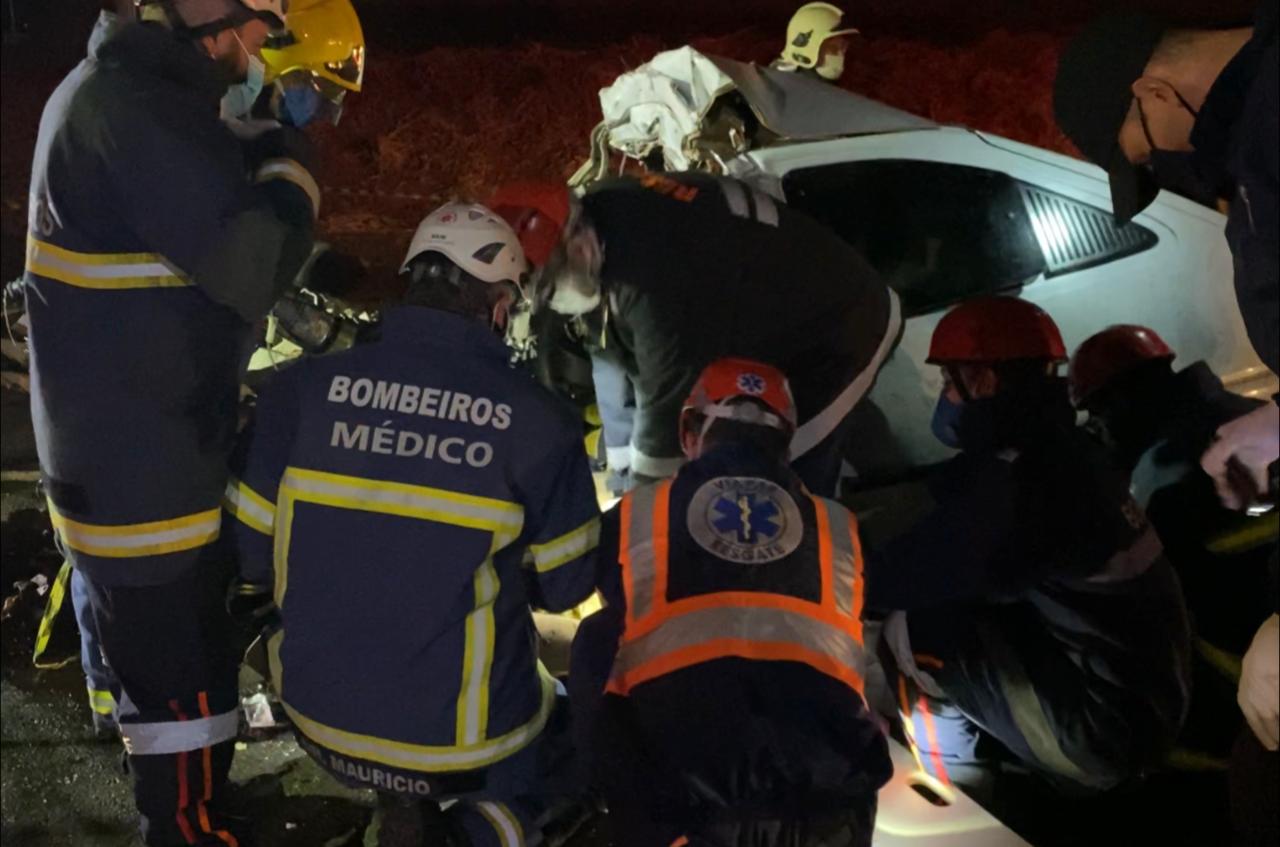 Maringá, 05/07/2020 – Em torno da 1h desta madrugada de domingo (05), o Corpo de Bombeiros foi acionado para apoio à concessionária de rodovias VIAPAR para atendimento de uma colisão frontal entre um automóvel e um ônibus, com quatro vítimas graves presas às ferragens, no KM 198 da BR-376 em Marialva na pista sentido Maringá. Após a avaliação inicial, constatou-se que todas as quatro vítimas eram do automóvel, das quais três estavam em óbito, e a quarta extremamente grave.