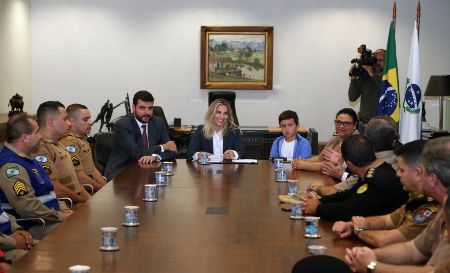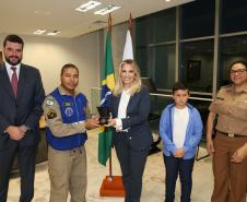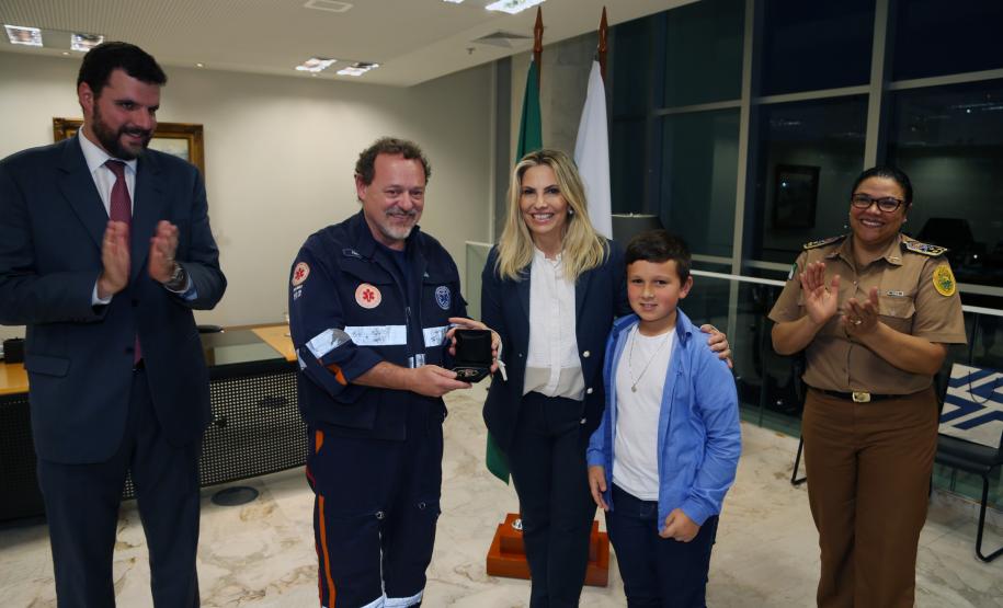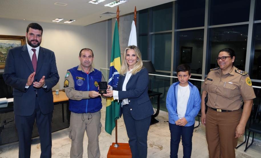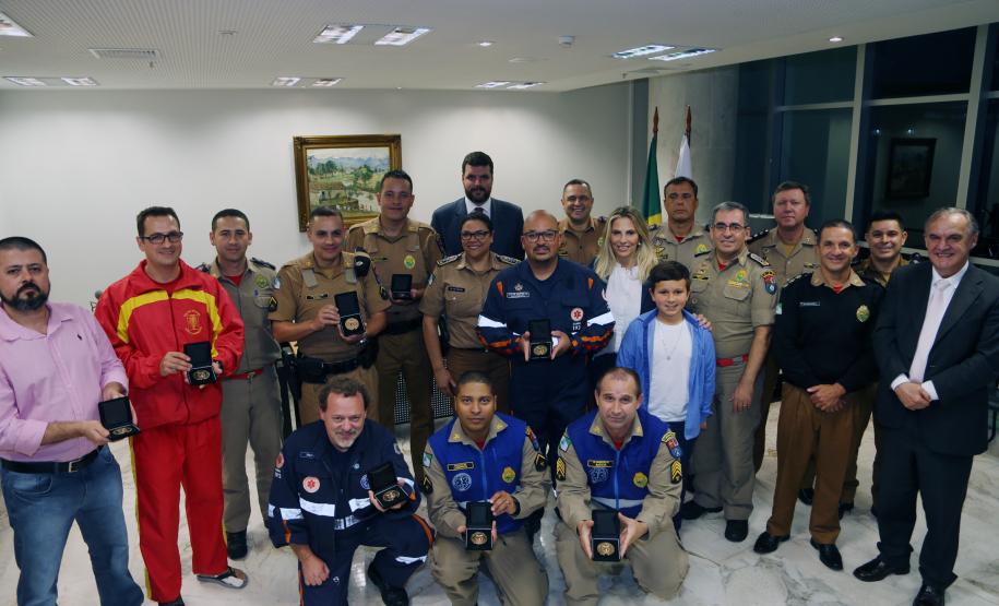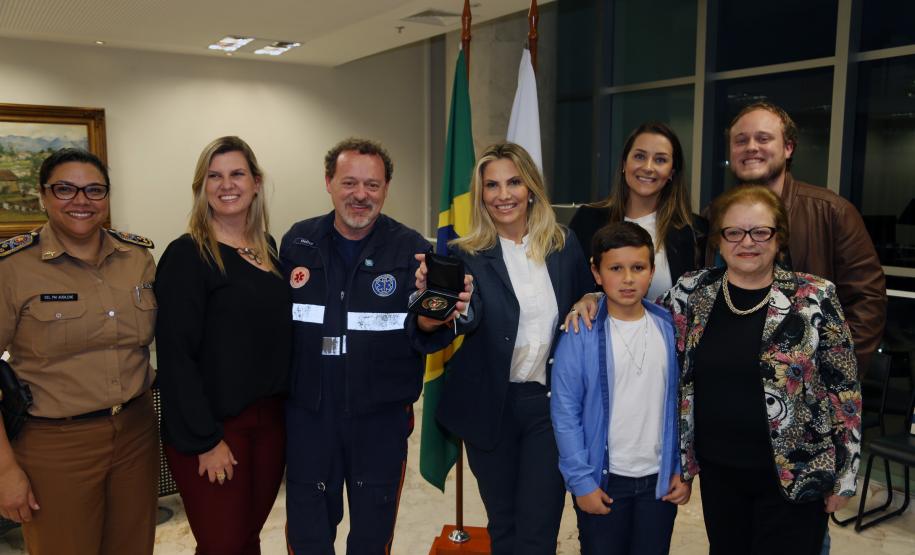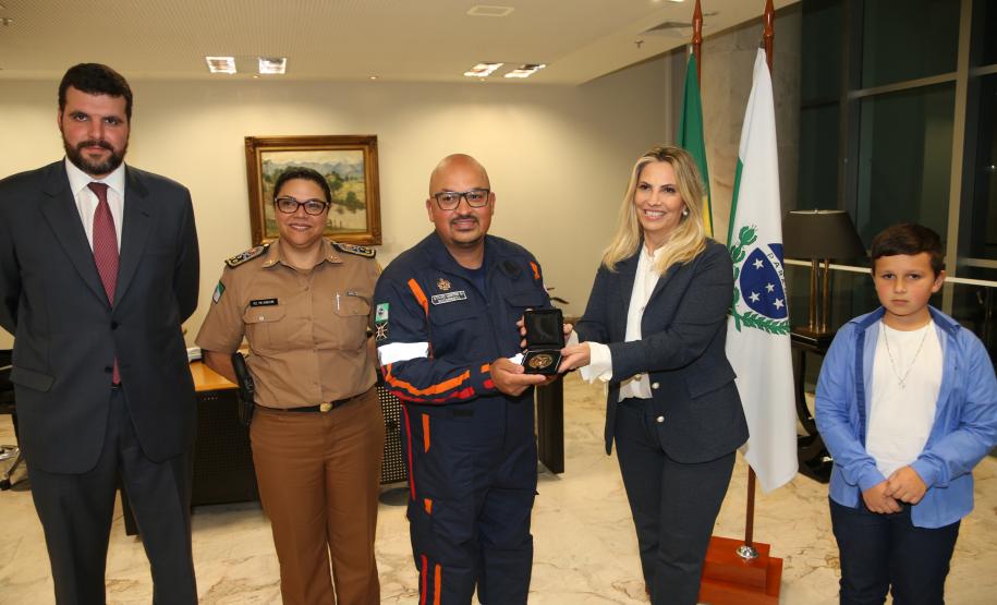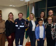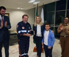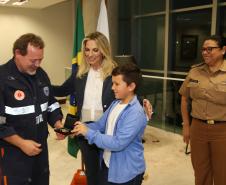 O Governo do Paraná homenageou nesta segunda-feira (25), no Palácio Iguaçu, a equipe formada por bombeiros socorristas e por equipe médica do SIATE , que salvou a vida do cabo Gulhinski, da Polícia Militar, baleado por criminosos, no dia 10 de junho, perto da Rodoviária de Curitiba ao abordar um carro ocupado por criminosos, que trafegava na contramão.