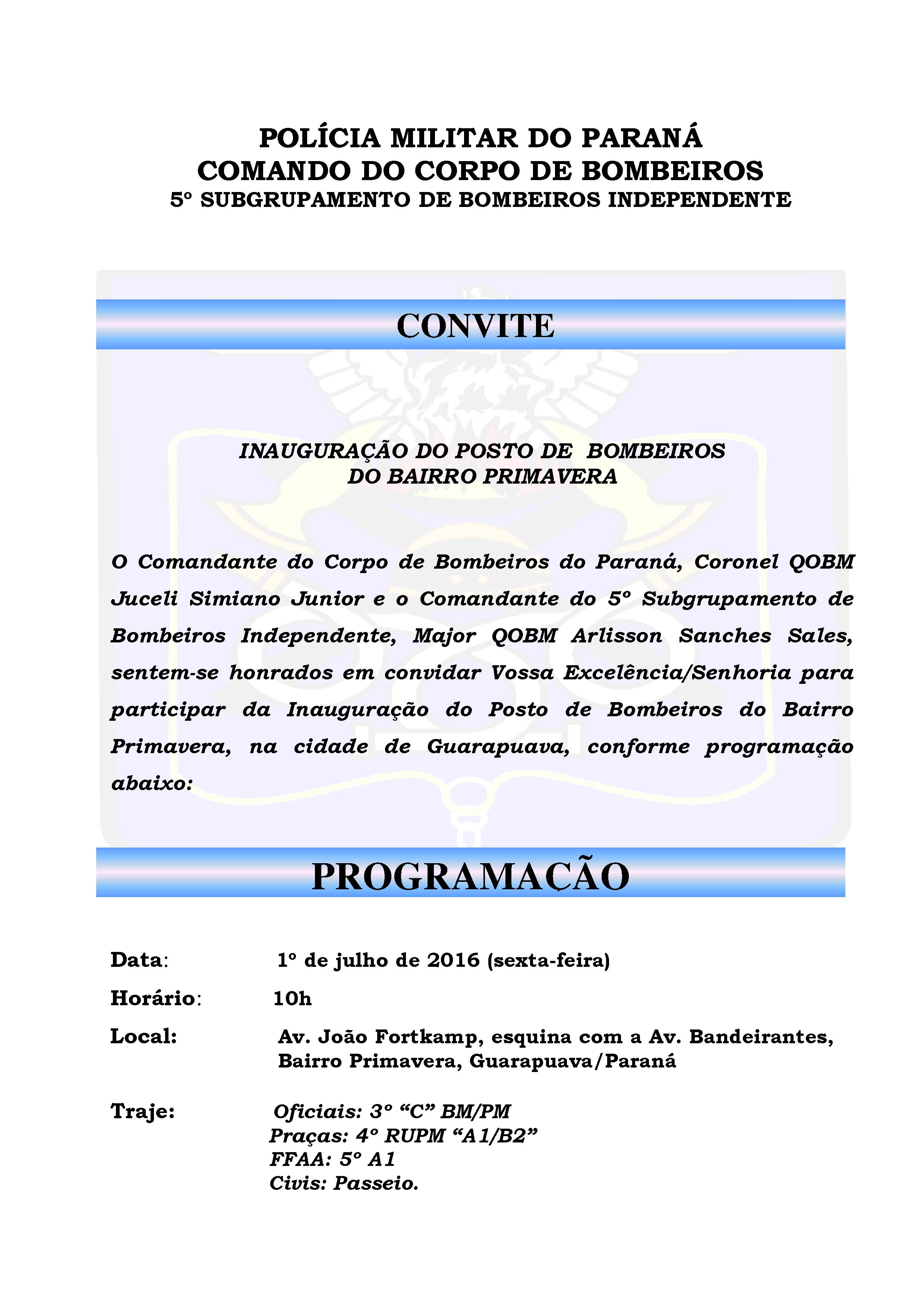 5º CIBM - Paranavaí Inauguração de Posto de Bombeiros 20/06/2016 - 16:19 GALERIA DE IMAGENS Compartilhe: Voltar Início Imprimir Baixar