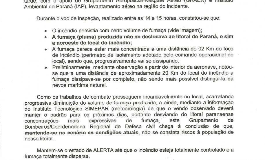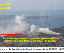 Buscando manter a população constantemente informada e realizar um levantamento mais preciso a respeito da real situação e comportamento da fumaça (pluma) produzida pelo incêndio em São Francisco do Sul no Estado de Santa Catarina, o 8º Grupamento de Bombeiros/8ª Coordenadoria Regional de Defesa Civil (Litoral do PR) realizou nesta tarde, com o apoio do Grupamento Aeropolicial-Resgate Aéreo (GRAER) e Instituto Ambiental do Paraná (IAP), levantamento aéreo na região do incidente.