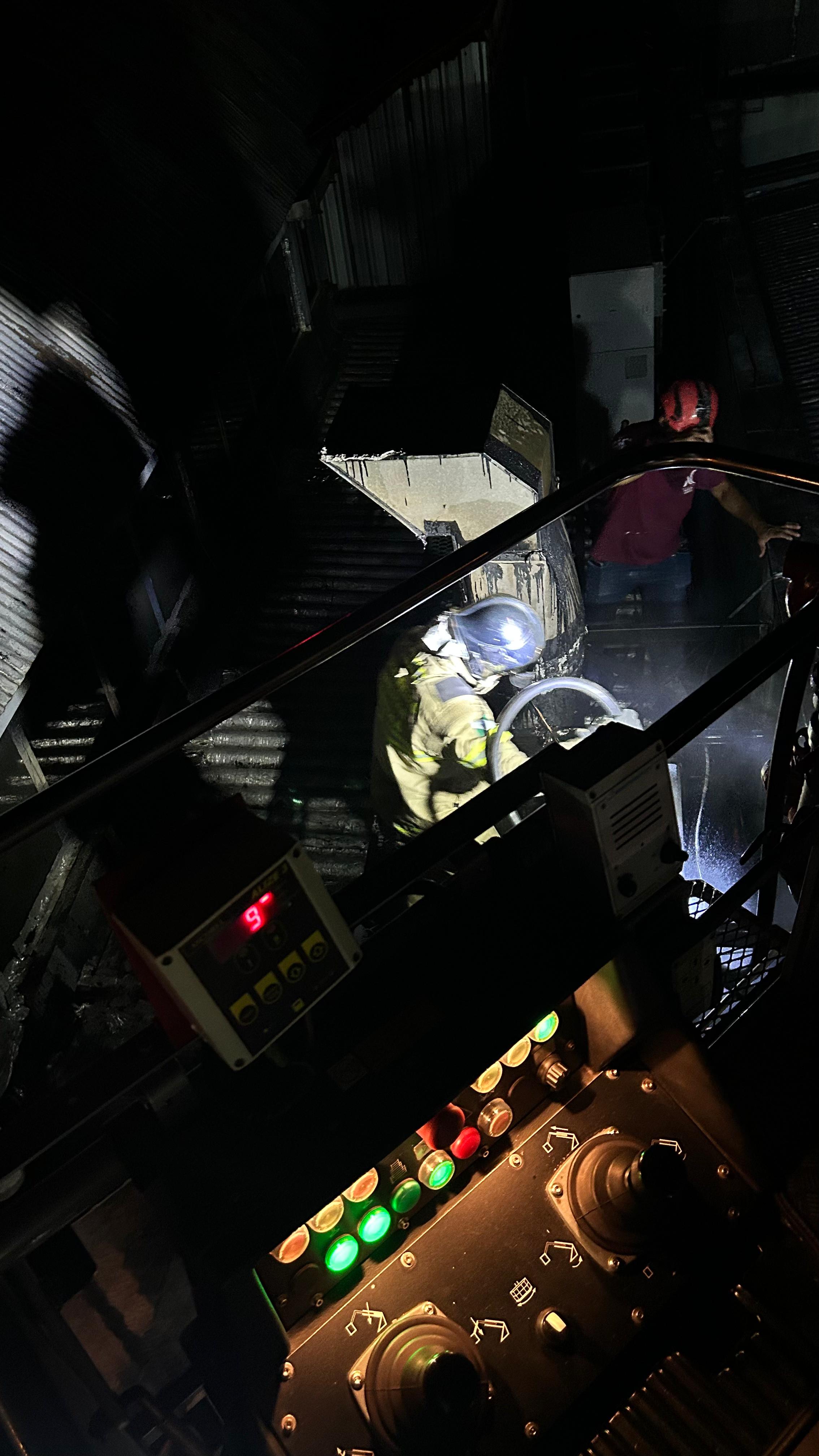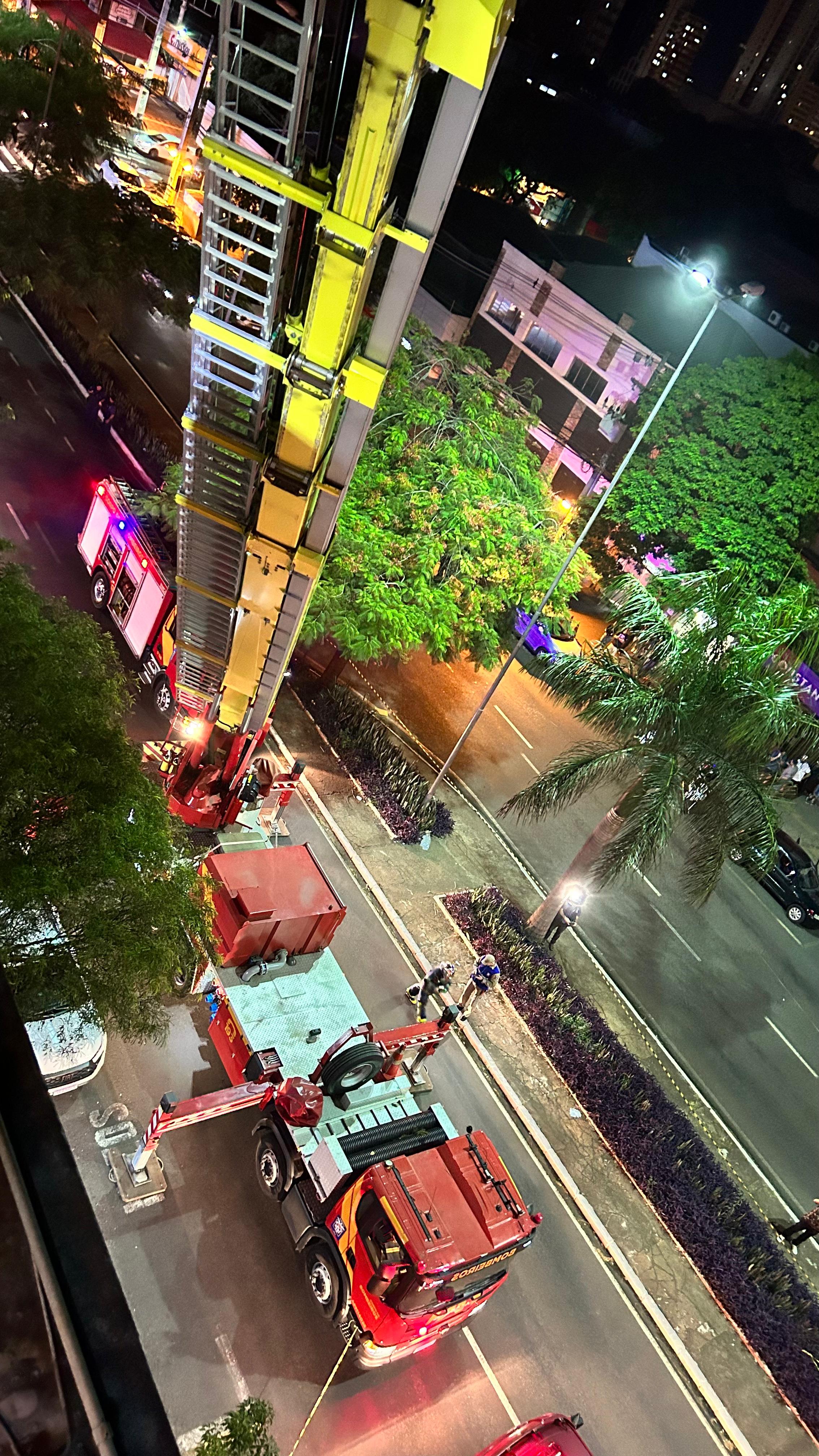 A aplicação da plataforma mecânica neste sinistro permitiu combater externamente um segmento de incêndio que se propagou para estruturas na cobertura do imóvel, impedindo seu alastramento para adjacências.