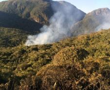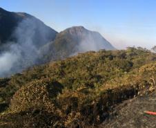 Bombeiros combateram um incêndio que queimou cerca de 6 hectares de mata nativa no Morro Pelado, na Serra do Mar, região de Morretes.