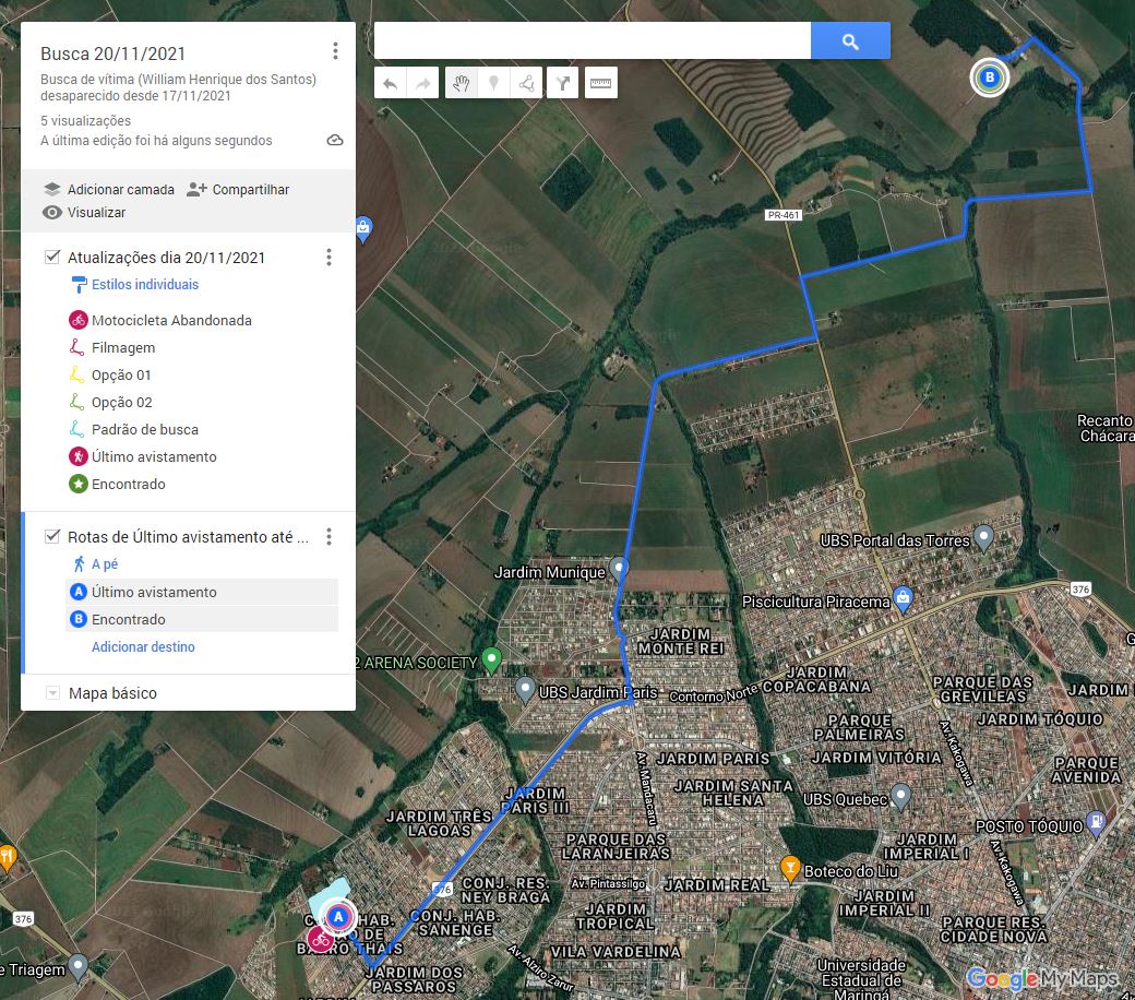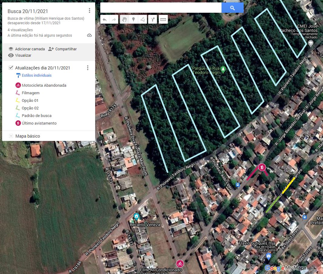 Após 3 dias infrutíferos, hoje dia 20, a família procurou o Corpo de Bombeiros que, a partir dos dados fornecidos, iniciou uma busca terrestre no Parque da Rua Teodoro Negri concomitante à divulgação das imagens do rapaz para a imprensa.