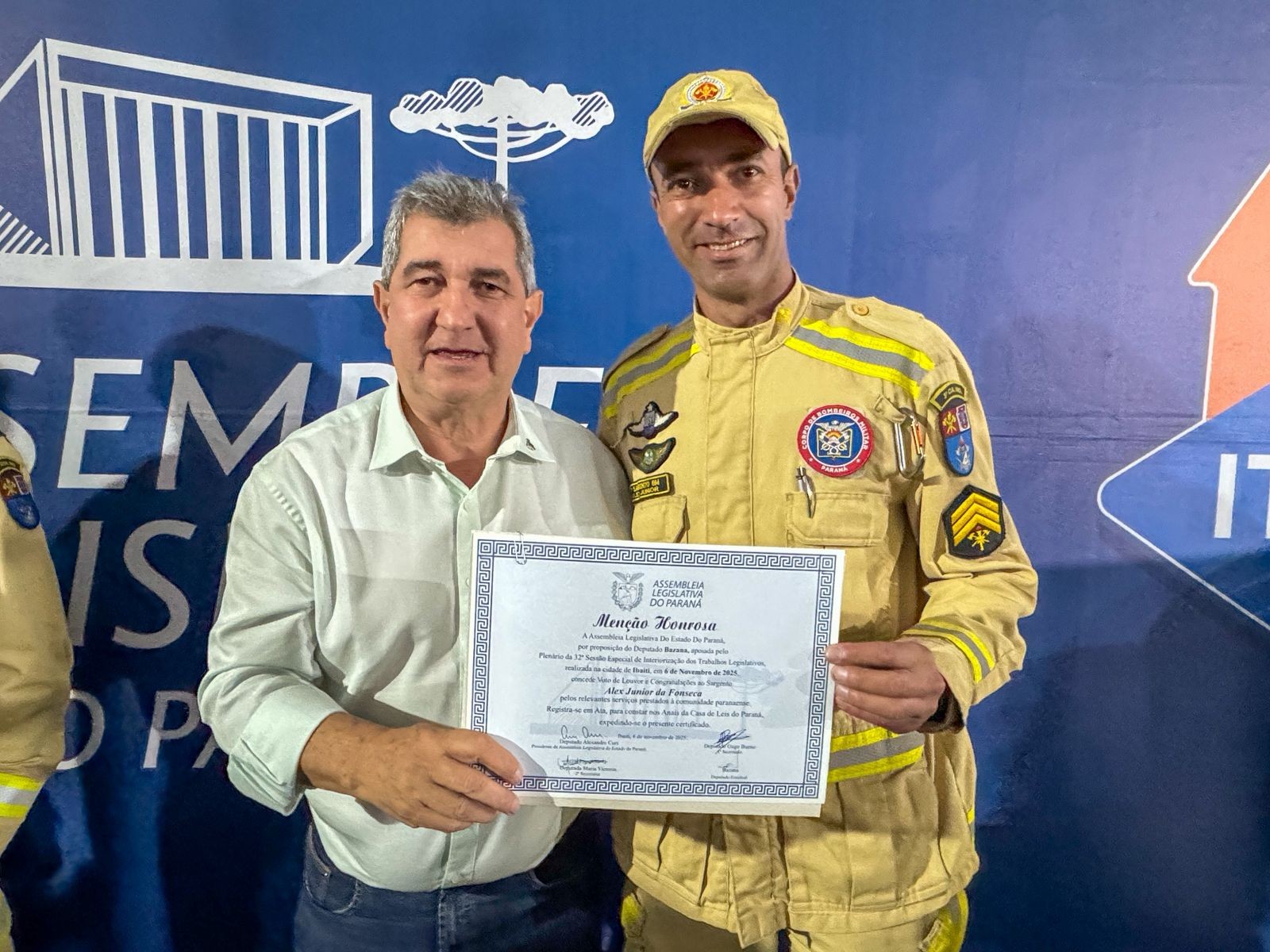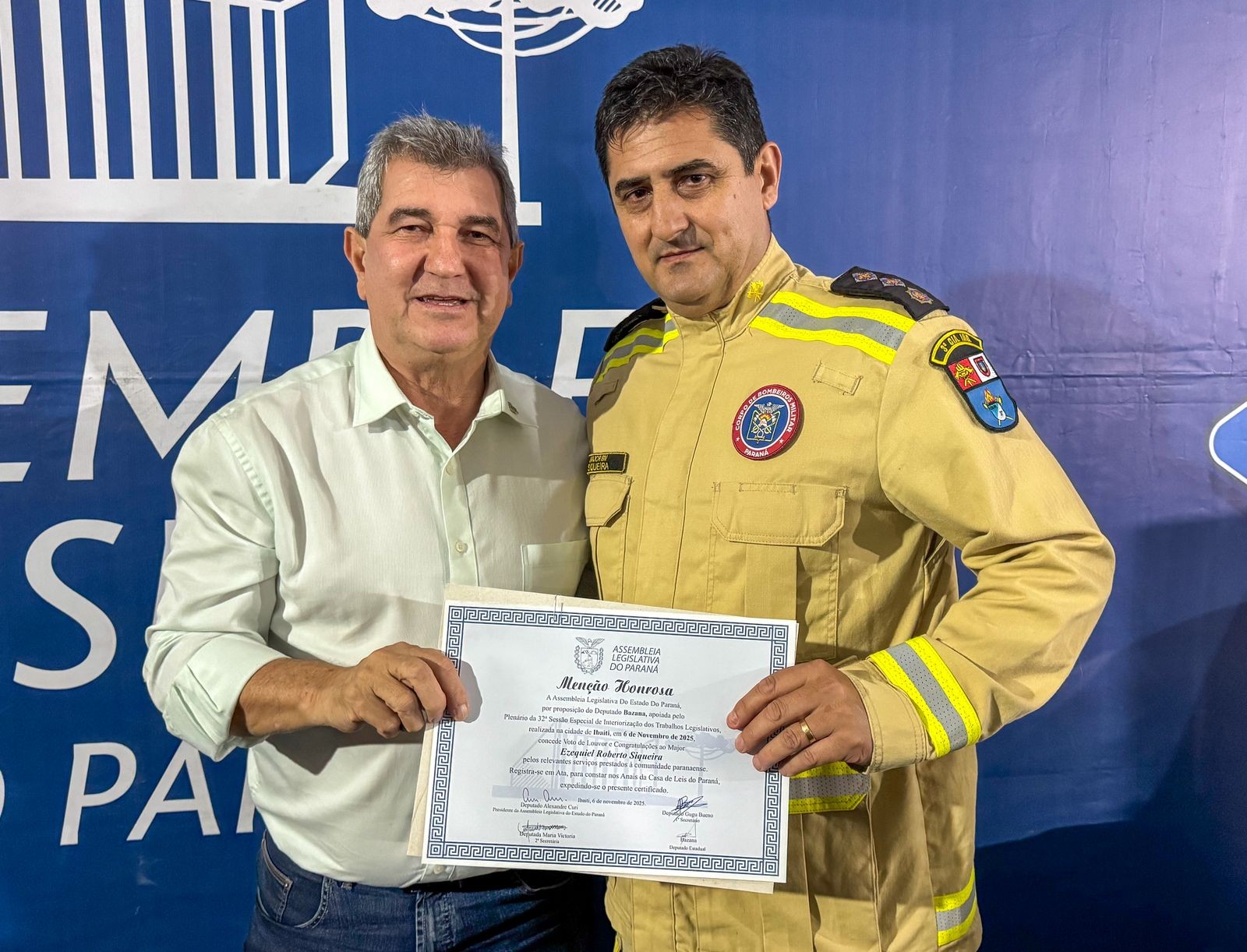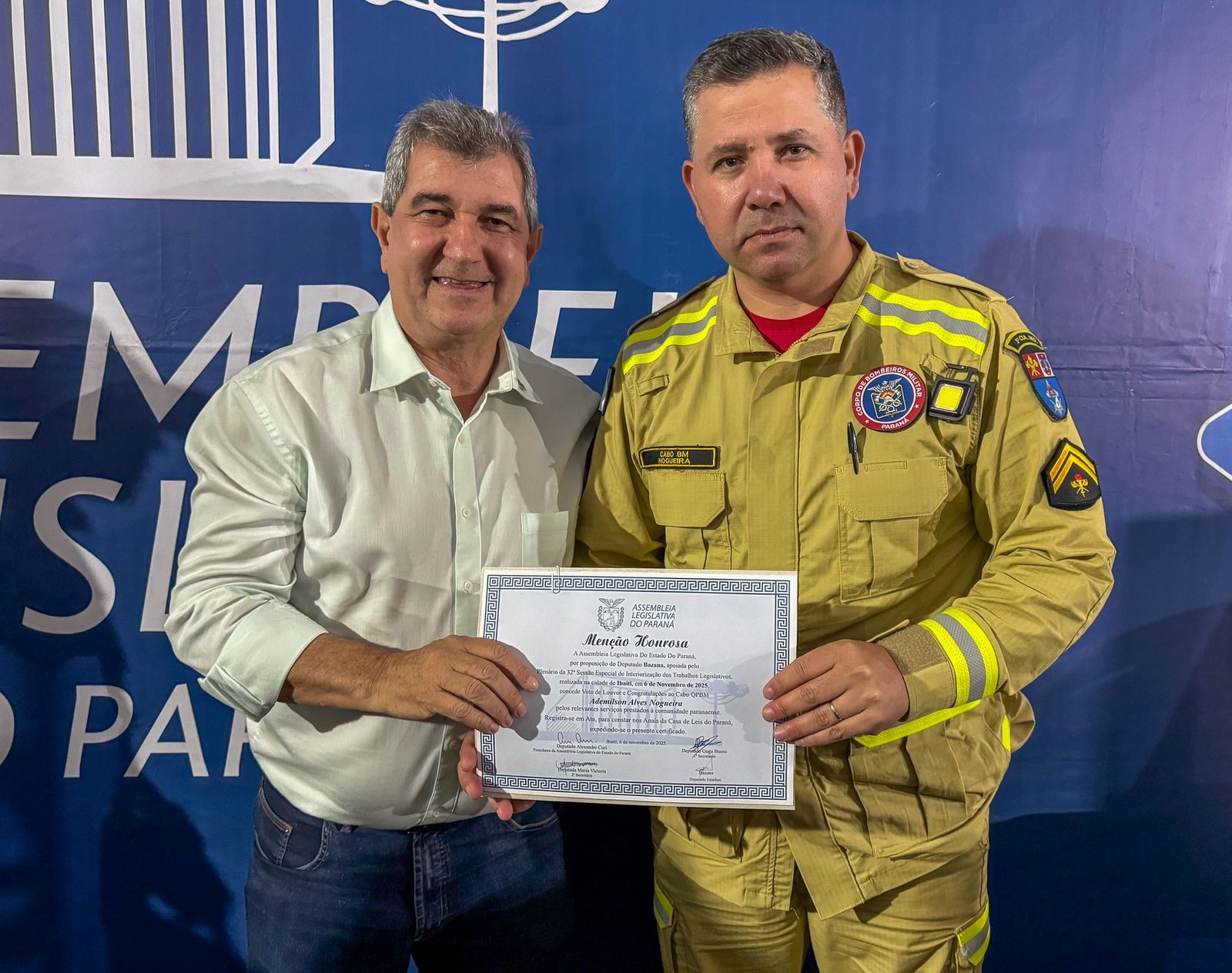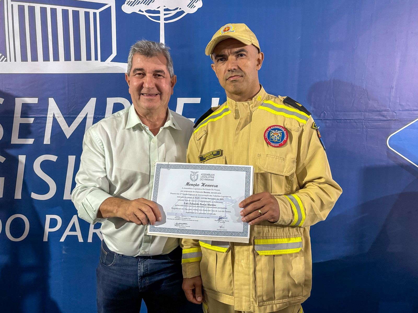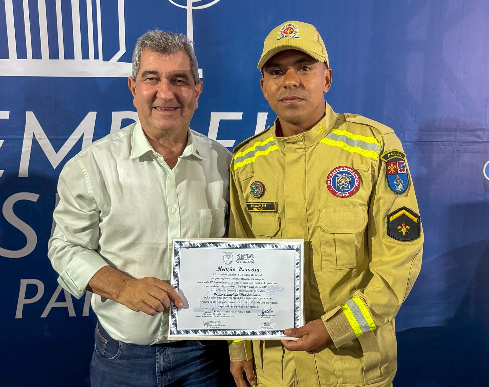 A 3ªCIBM expressa seu sincero agradecimento ao Deputado Bazana pela honrosa indicação e ao Deputado Alexandre Curi, presidente da Assembleia Legislativa do Paraná, pelo apoio institucional à valorização dos bombeiros militares.
