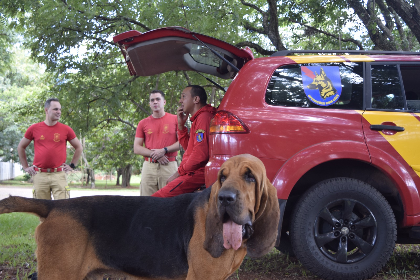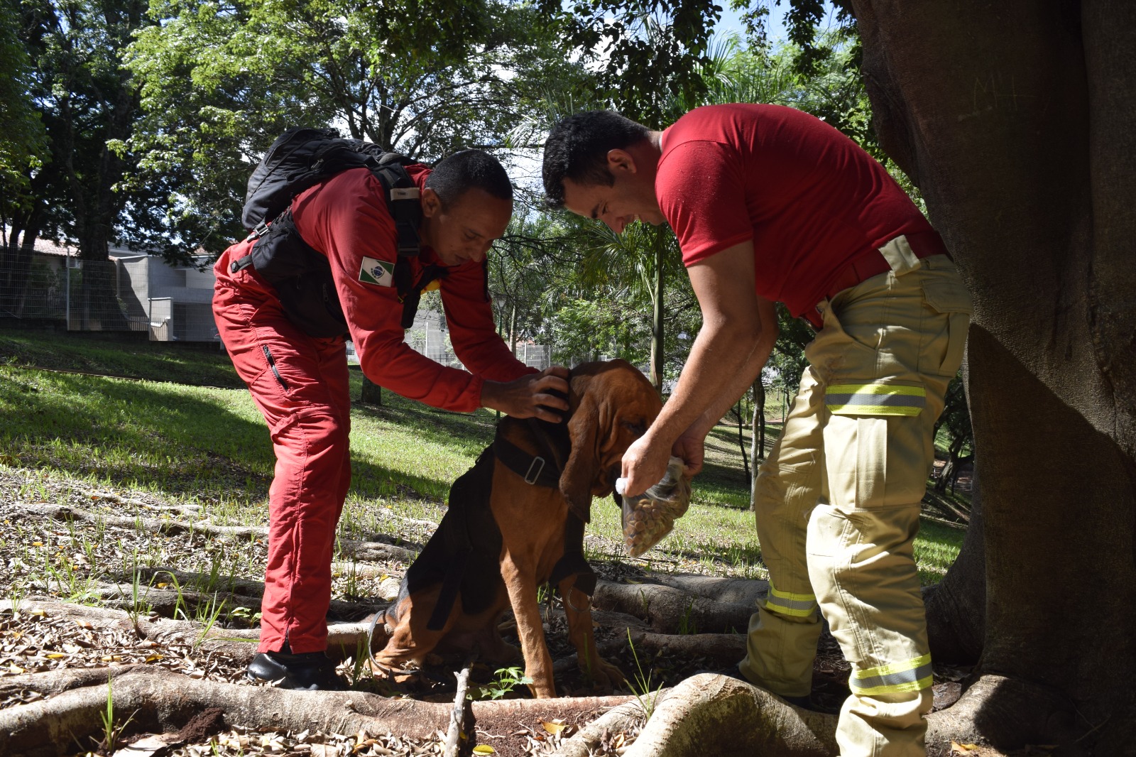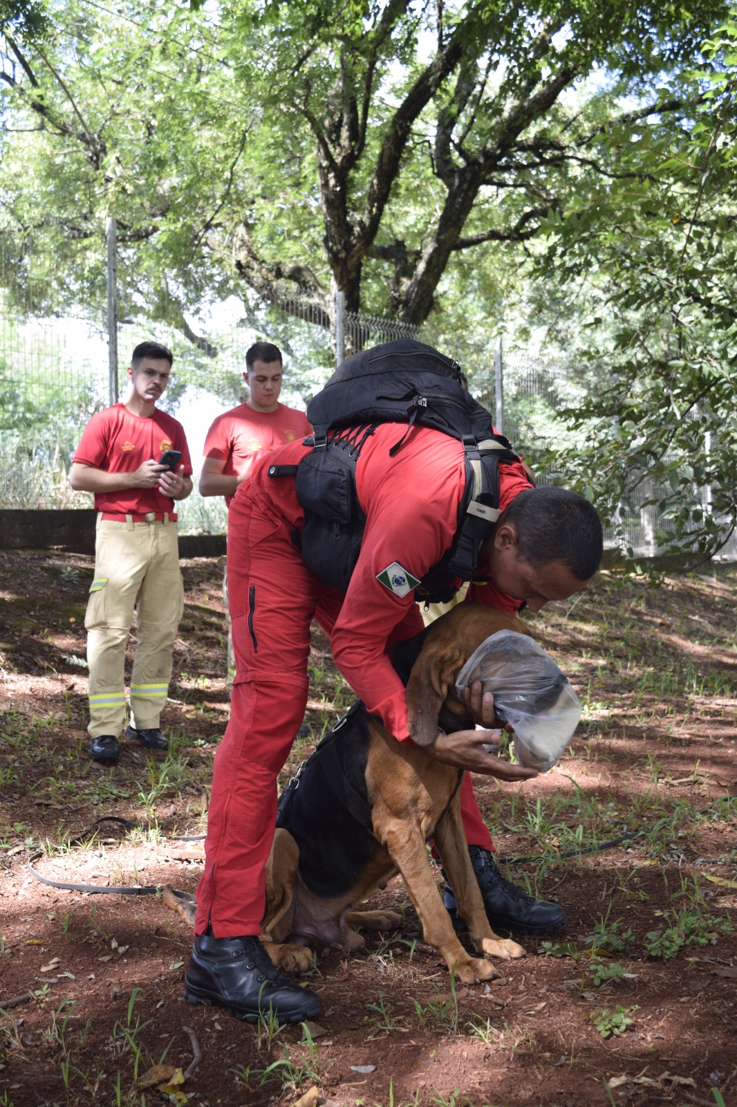Em situações de desaparecimento de pessoas, vítimas presas em colapsos estruturais, soterradas assim como em busca de cadáveres o emprego de cães vem sendo amplamente utilizado nas buscas terrestres, otimizando resultados e reduzindo tempo-resposta. Por outro, a aplicação desse recurso requer um binômio treinado: homem e cão treinados previamente para a situação que é extremamente desafiadora, hostil e desgastante.