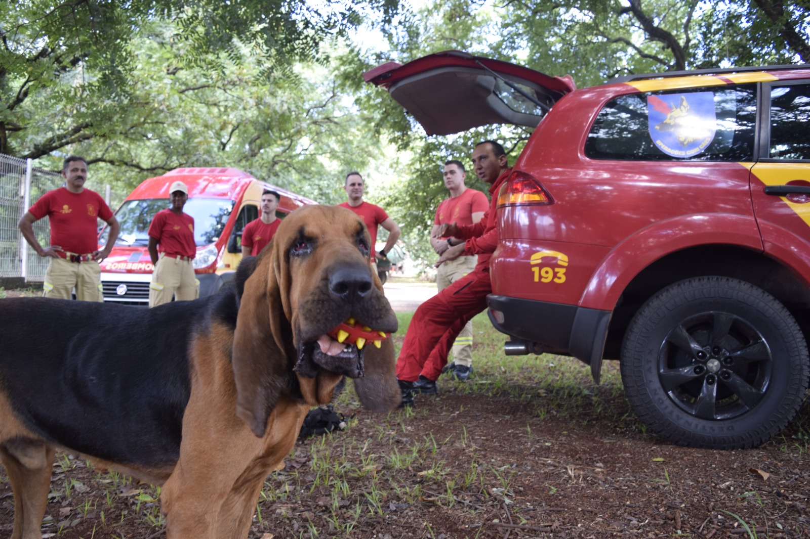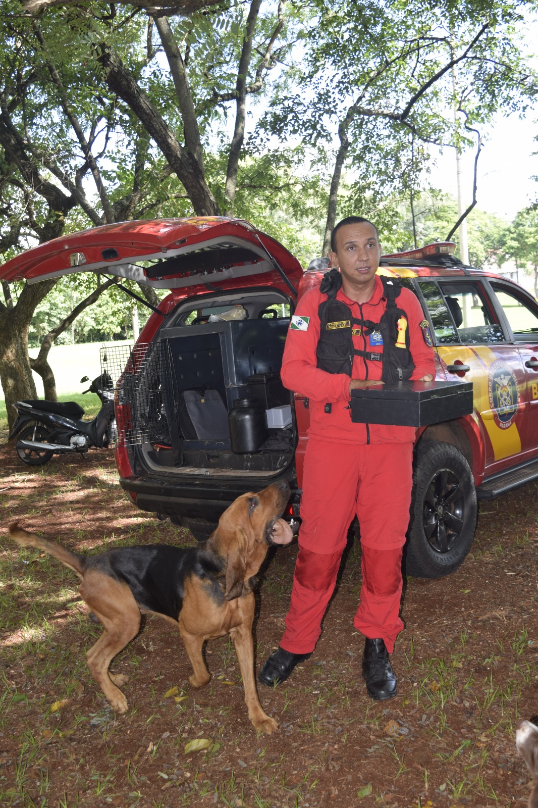 Quartel Central do 5º Grupamento de Bombeiros (Maringá, 04/03/2024) - Na última sexta-feira (1º), o 5º Grupamento de Bombeiros recebeu o bombeiro militar Sargento Sousa Vaz, de Cianorte, acompanhado de Horus, cão de busca da raça Bloodhound, que vieram para ministrar Instrução de Cães de Busca e Salvamento a militares do 5ºGB.