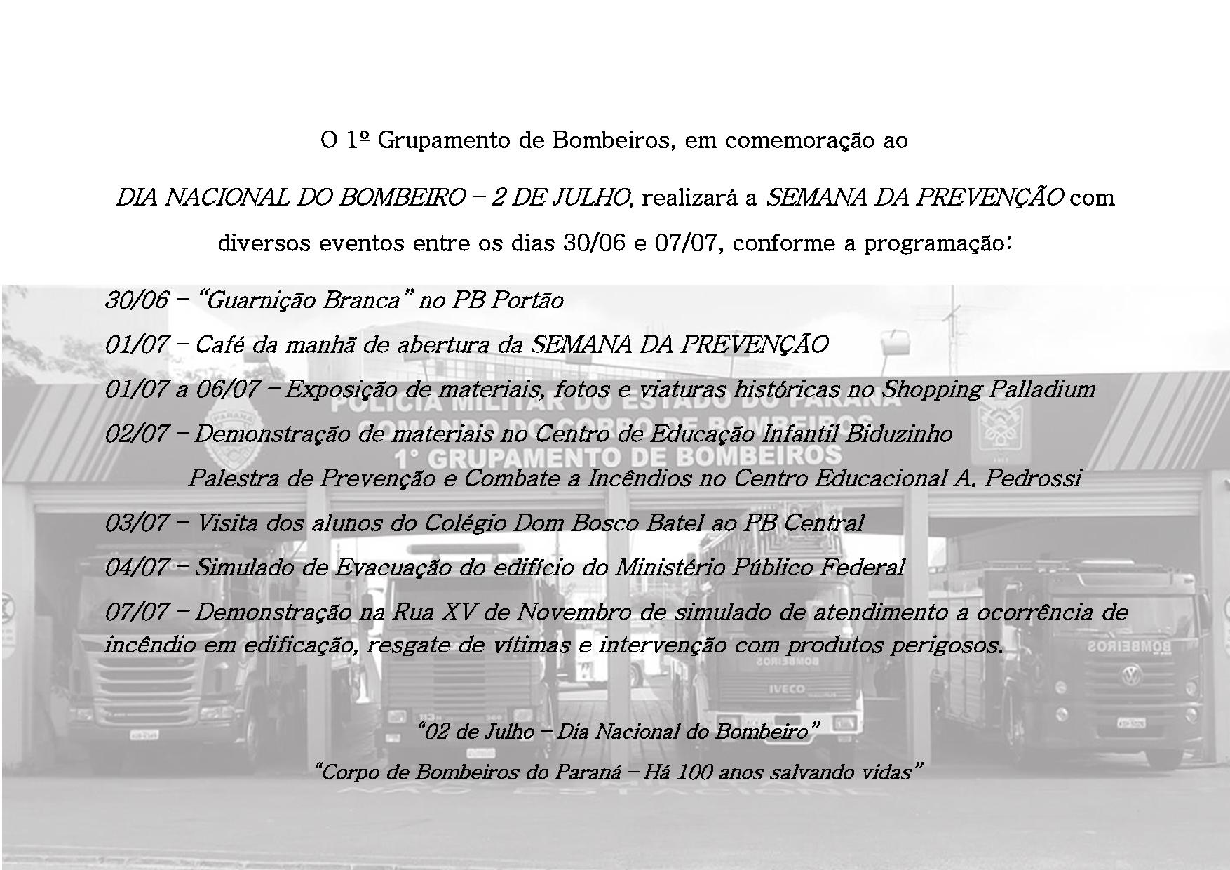 1º Batalhão Bombeiro Militar - Curitiba O 1º Grupamento de Bombeiros, em comemoração ao DIA NACIONAL DO BOMBEIRO – 2 DE JULHO, realizará a SEMANA DA PREVENÇÃO 27/06/2013 - 16:34 GALERIA DE IMAGENS Compartilhe: Voltar Início Imprimir Baixar