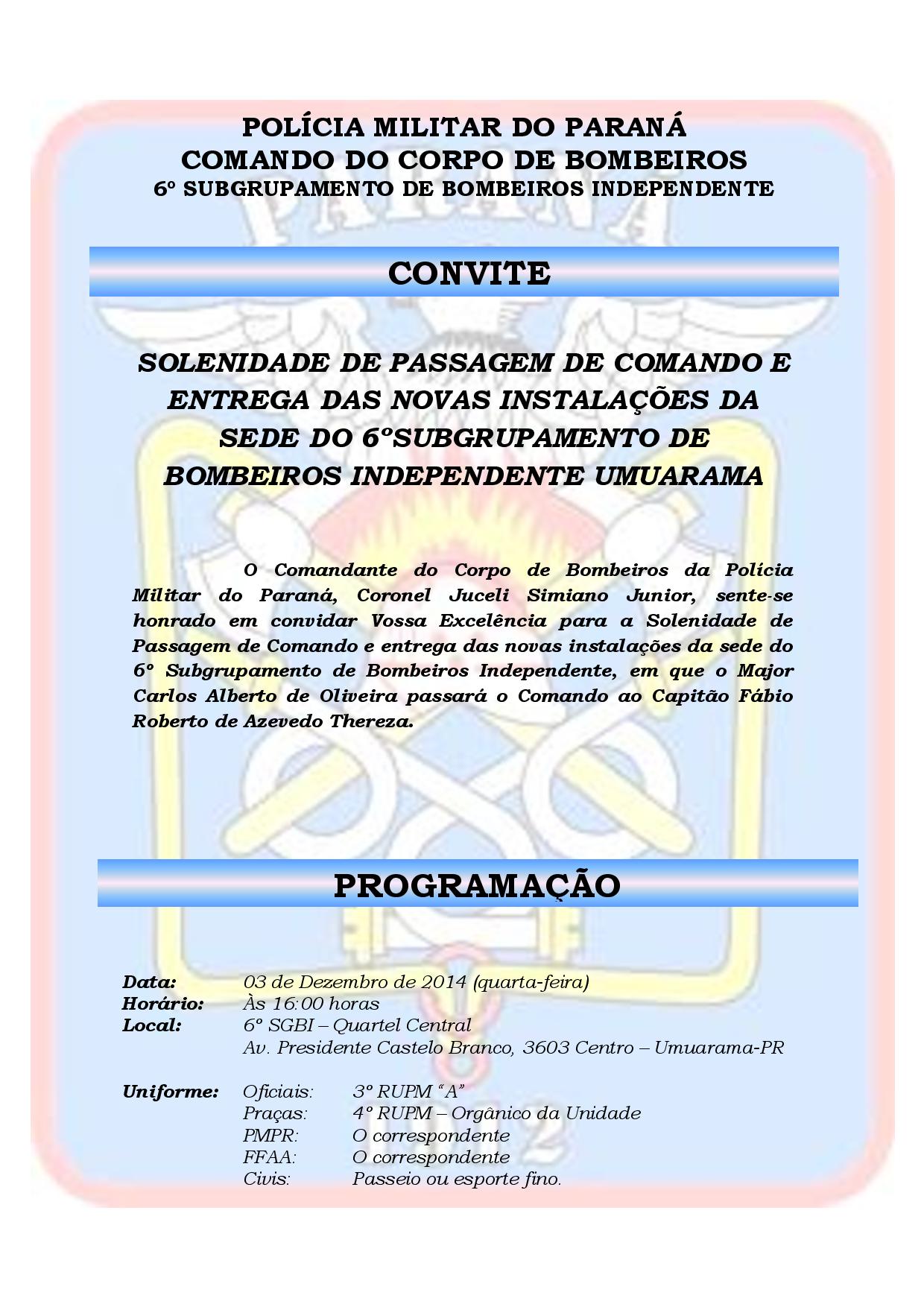 O Comandante do Corpo de Bombeiros da Polícia Militar do Paraná, Coronel Juceli Simiano Junior, sente-se honrado em convidar Vossa Excelência para a Solenidade de Passagem de Comando e entrega das novas instalações da sede do 6° Subgrupamento de Bombeiros Independente, em que o Major Carlos Alberto de Oliveira passará o Comando ao Capitão Fábio