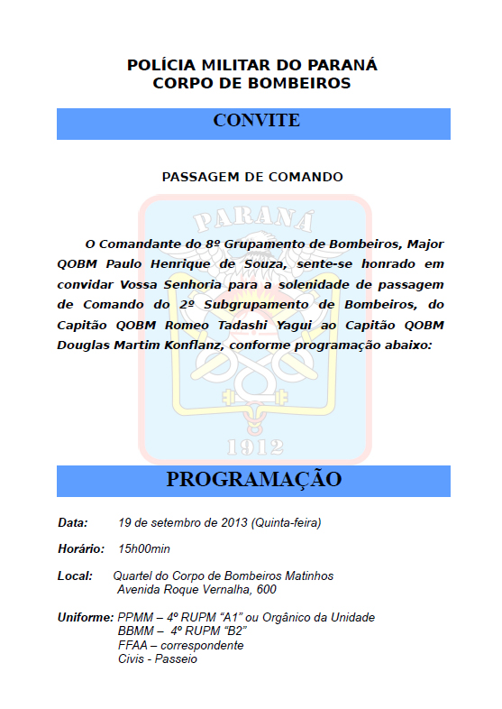 O Comandante do Corpo de Bombeiros, Coronel Juceli Simiano Junior, e o Comandante do 8º Grupamento de Bombeiros, Major Paulo Henrique de Souza, sentem-se honrados em convidar Vossa Senhoria para a passagem de Comando do Corpo de Bombeiros de Matinhos. - 2º Subgrupamento de Bombeiros do 8º Grupamento.