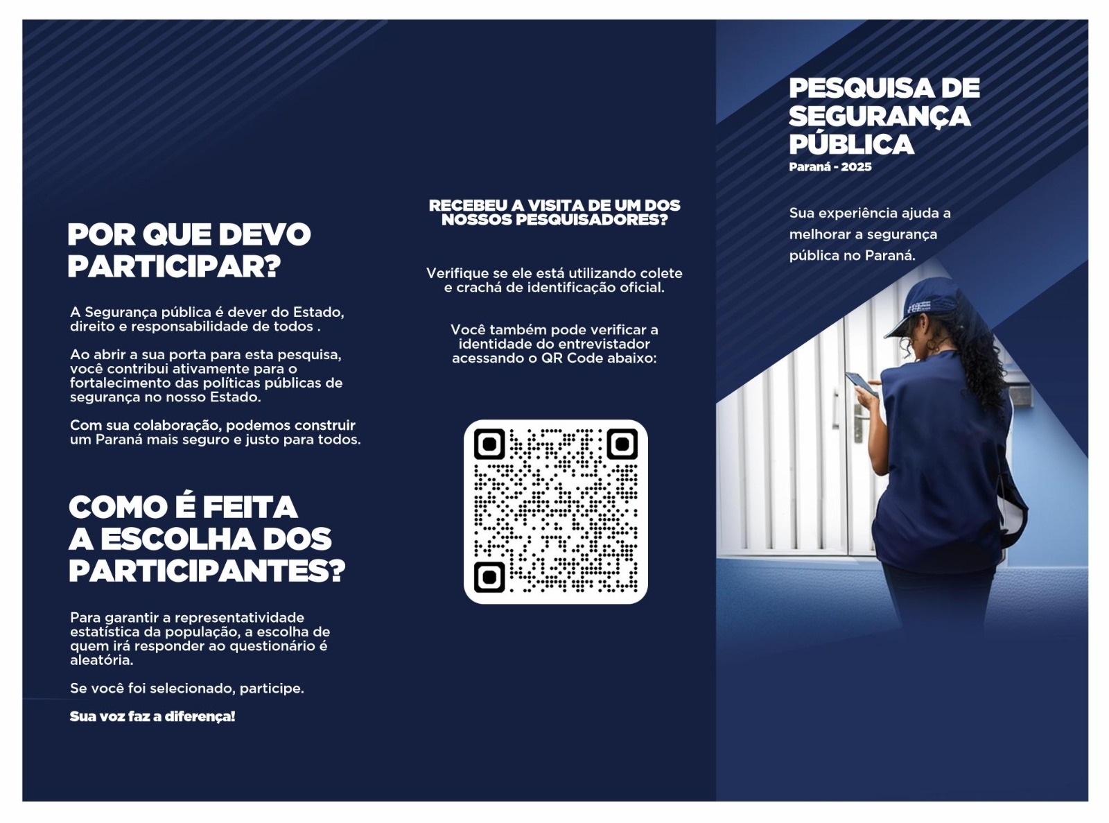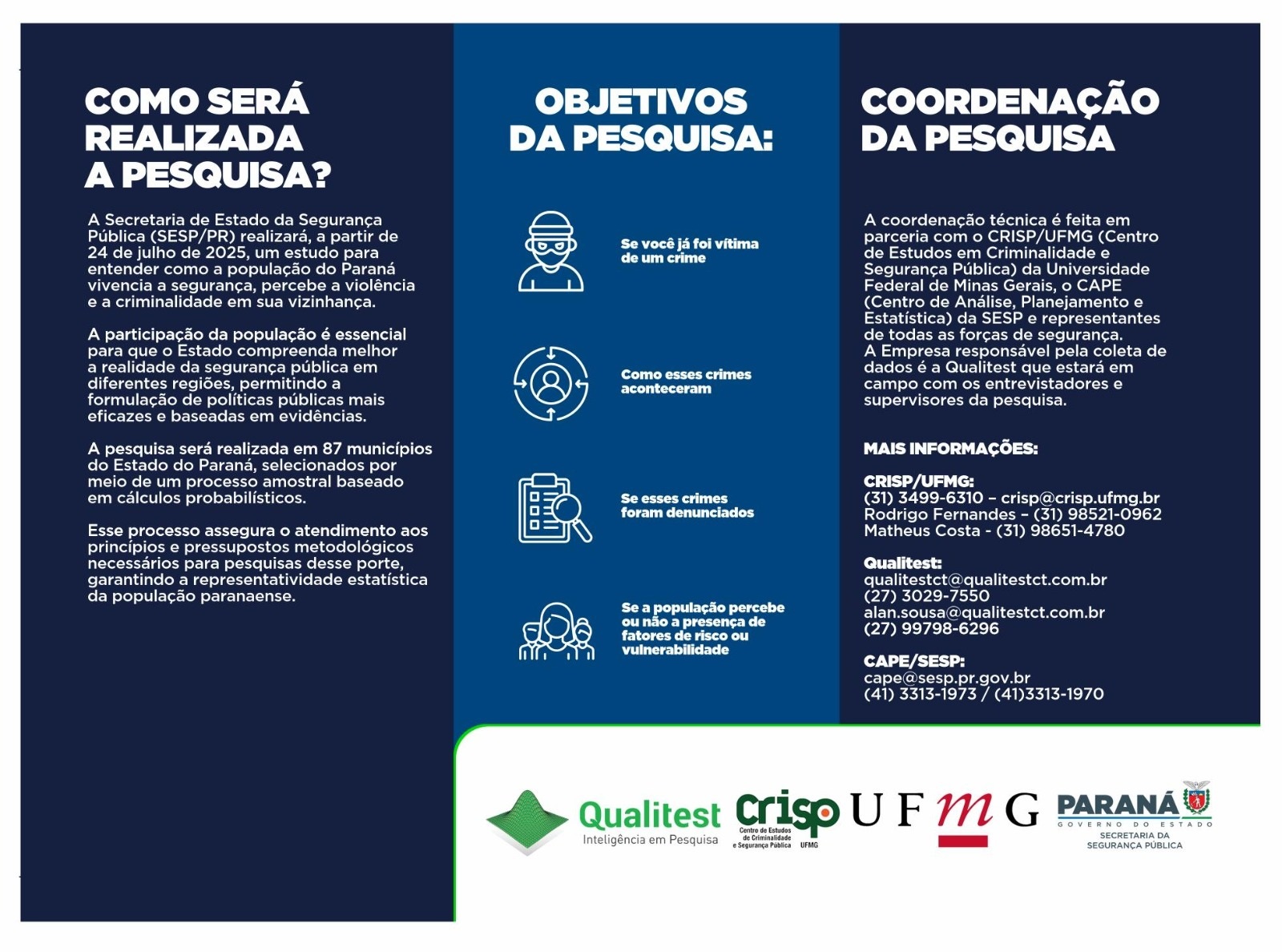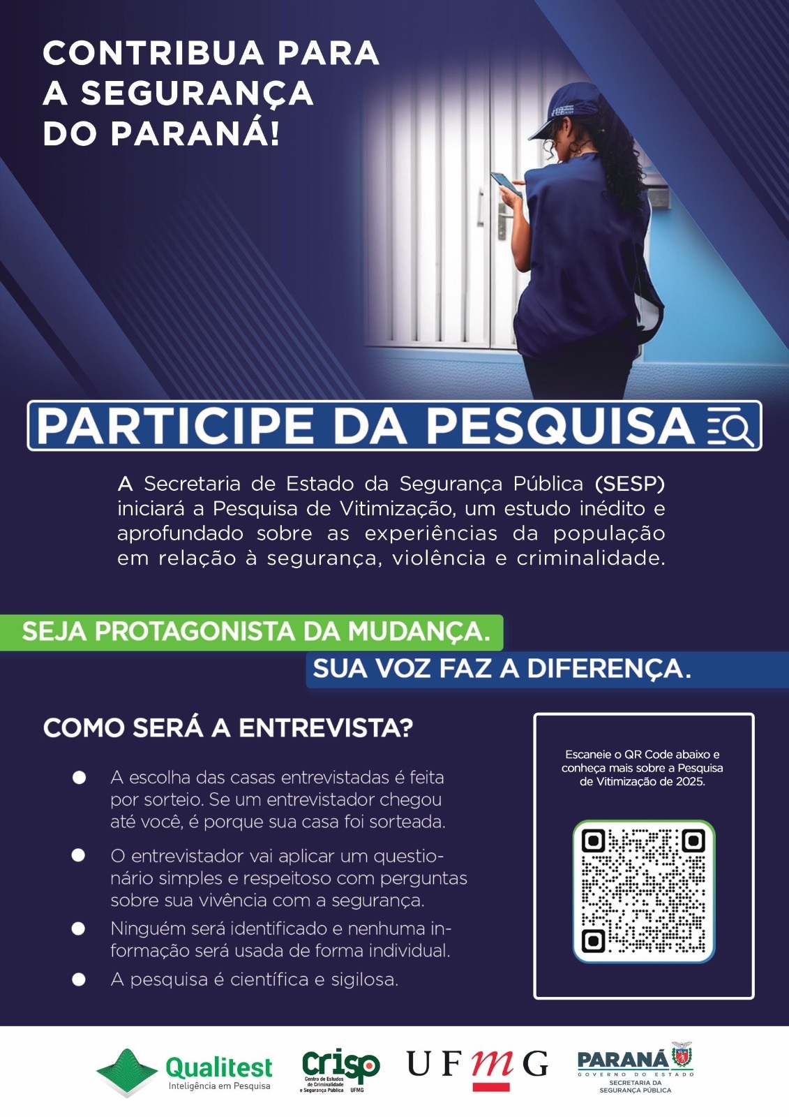 O Corpo de Bombeiros Militar do Paraná informa que a Secretaria Estadual de Segurança Pública (SESP), iniciará nos próximos dias a “Pesquisa de Vitimização”.