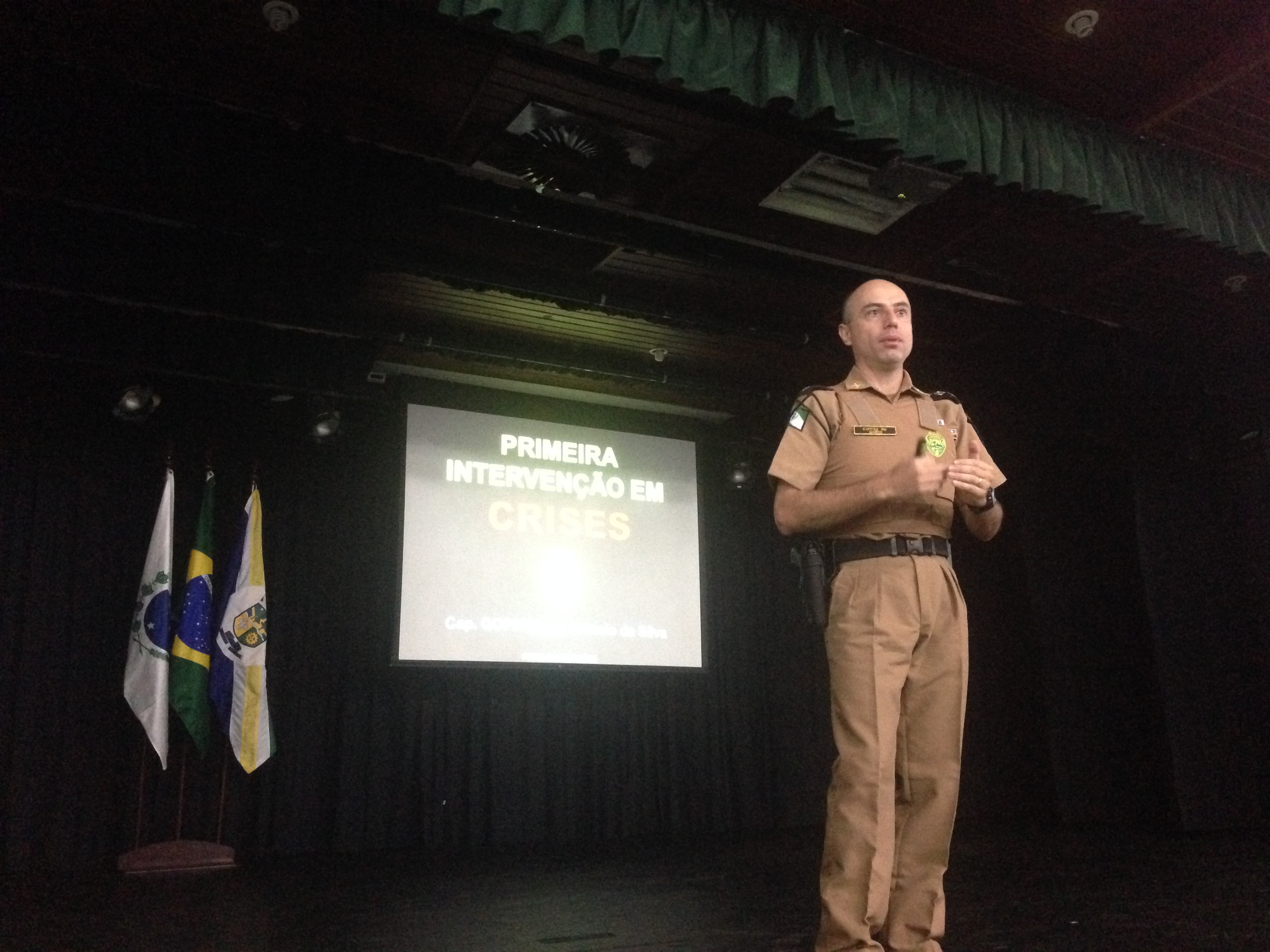 A brilhante palestra foi ministrada pelo Cap. Marco Antonio da Silva, que é formado em Psicologia, História e Estudos Sociais, além de uma série de cursos na área de negociação, incluindo Curso de Negociador FBI, Negociação de Crises com Reféns pelo GATE-SP (Grupos de Ações Táticas Especiais), Negociação em Crises pela Polícia Federal, Gerenciamento de Crises em Controle e Operações Especiais SWAT. O Cap. Marco comandou a equipe de negociação do BOPE/PMPR durante a Copa do Mundo FIFA 2014.