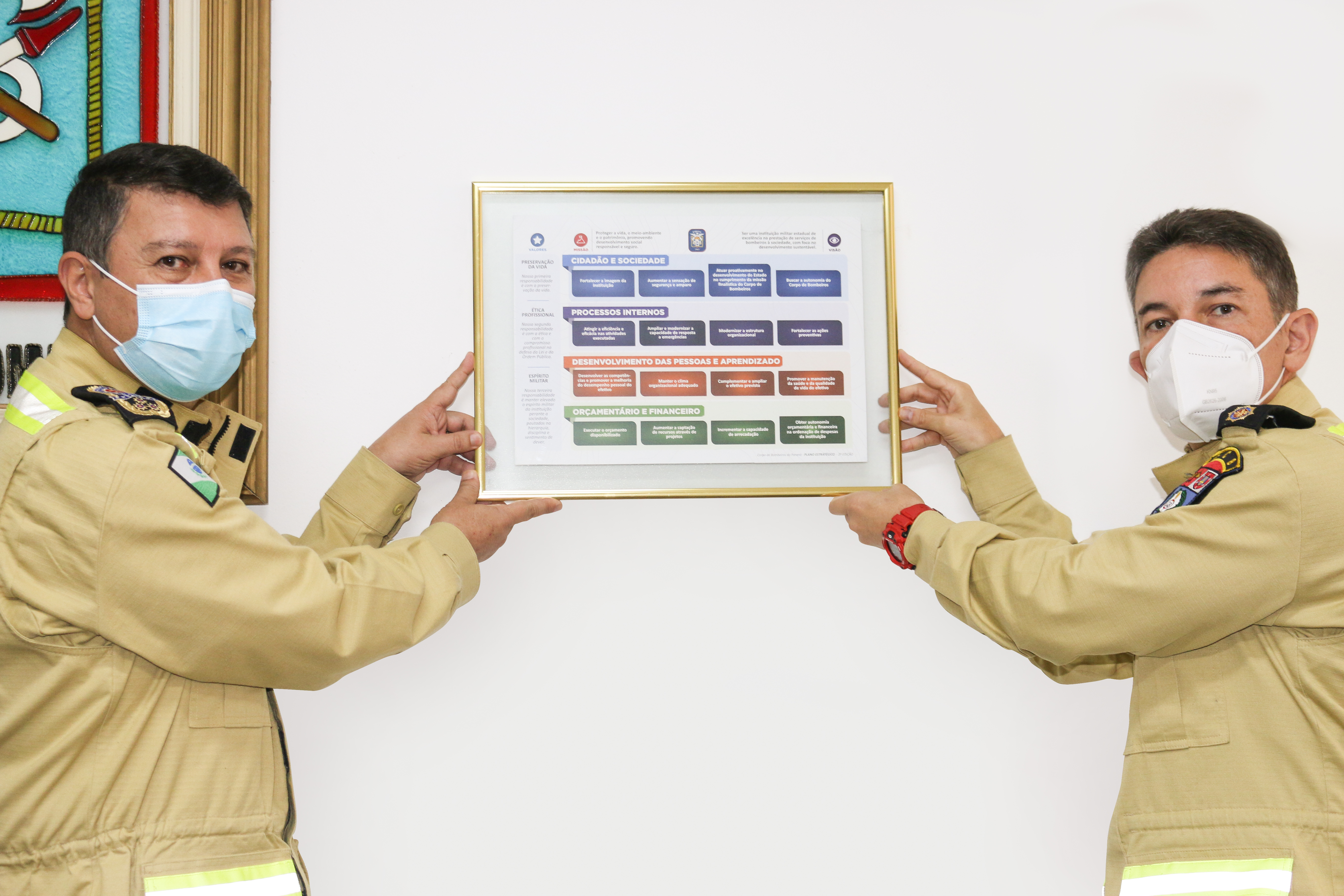 Para marcar esse passo dado pela instituição foi exposto pelo Cel. Gross e Cel. Vasco o material de divulgação das orientações do plano, tais como o tripé que compõe a missão, visão e valores e o mapa estratégico que volta atenção para o cidadão e a sociedade, processos internos, desenvolvimento de pessoas e a questão orçamentária e financeira.