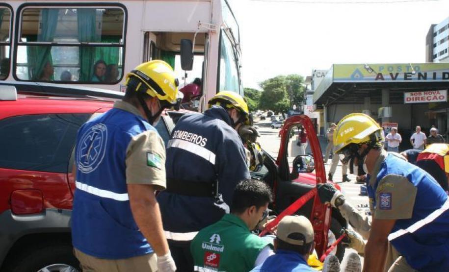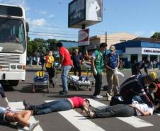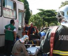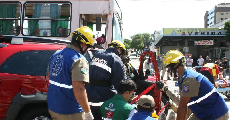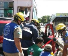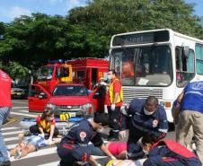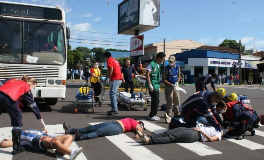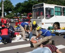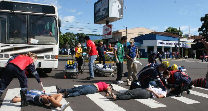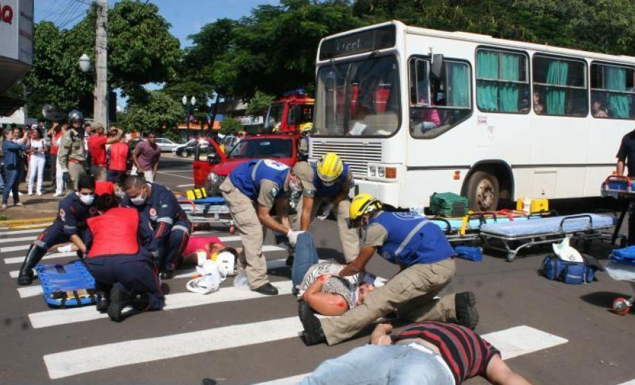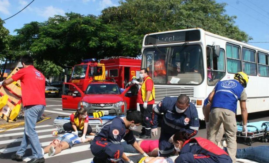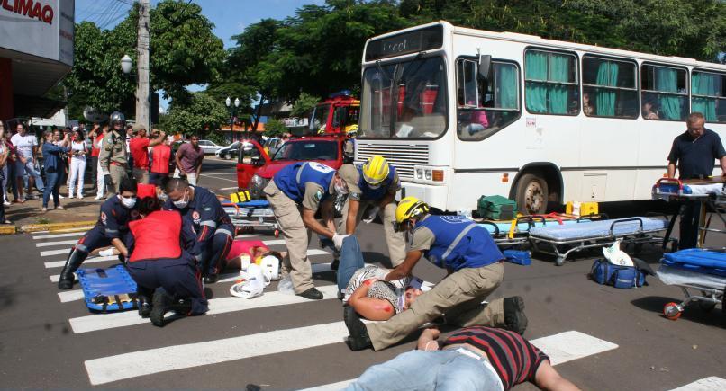 Um grande exercício simulando um AMUVI (Acidente com múltiplas vítimas) foi realizado na manhã desta quinta-feira (27), envolvendo Bombeiros e demais órgãos ligados a segurança e saúde do município de Umuarama. A simulação de um acidente com 25 vítimas, onde um ônibus com passageiros colidiu com um veículo de passeio, teve início às 10h, no cruzamento entre duas importantes vias de tráfego da cidade, as Avenidas Brasil e Ipiranga.