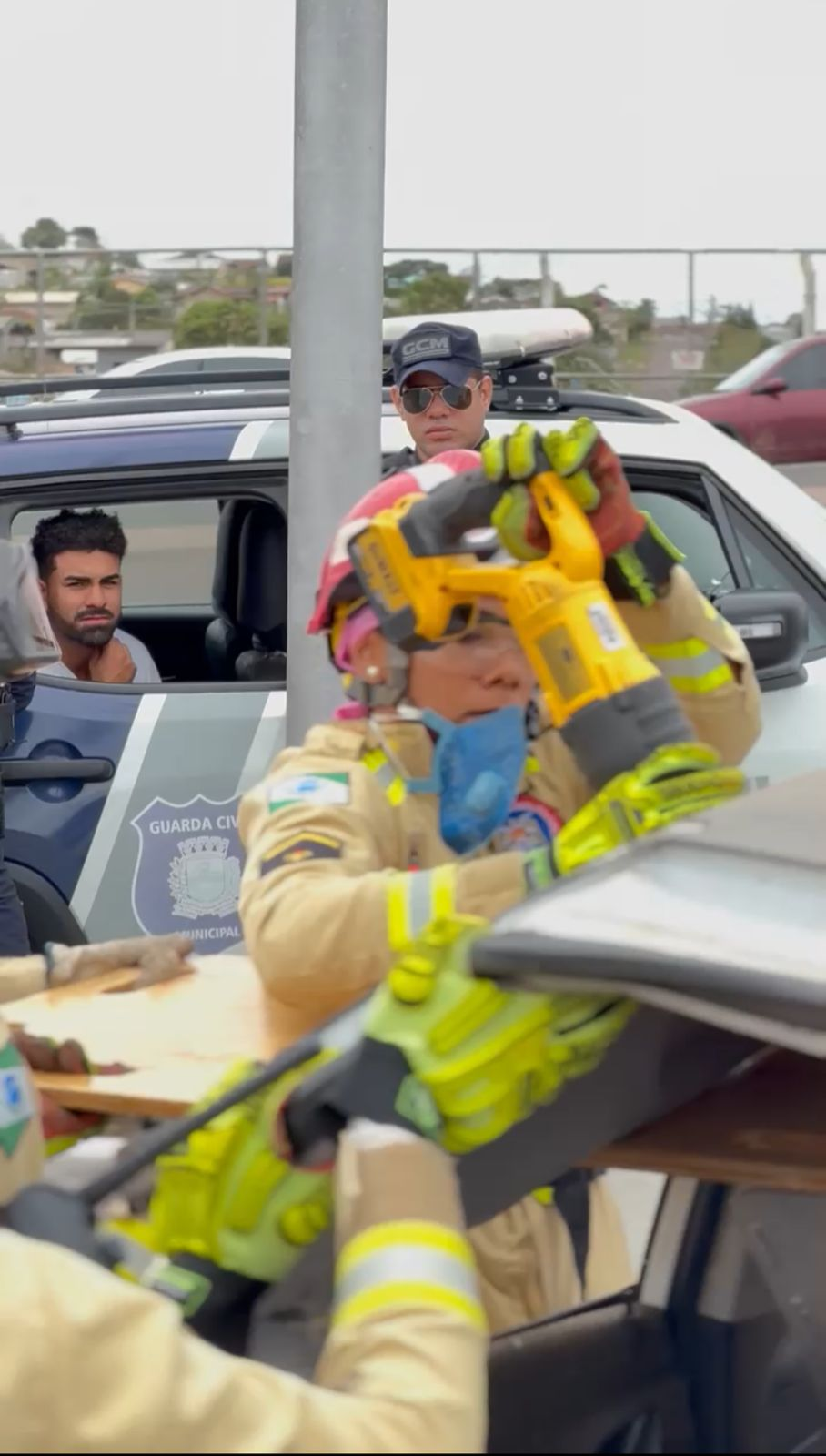 Aconteceu na terça-feira, dia 21/05, em Campina Grande do Sul, como parte da campanha Maio Amarelo, um simulado de atendimento de uma ocorrência de resgate veicular. Na ocasião, o cenário era de um atropelamento, seguido por um AUTO x ANTEPARO, onde o veículo, conduzido por um motorista embriagado que estava acompanhado de um amigo, invadiu a contramão e vitimou fatalmente uma pedestre e colidiu, frontalmente, em um poste.