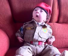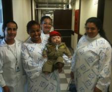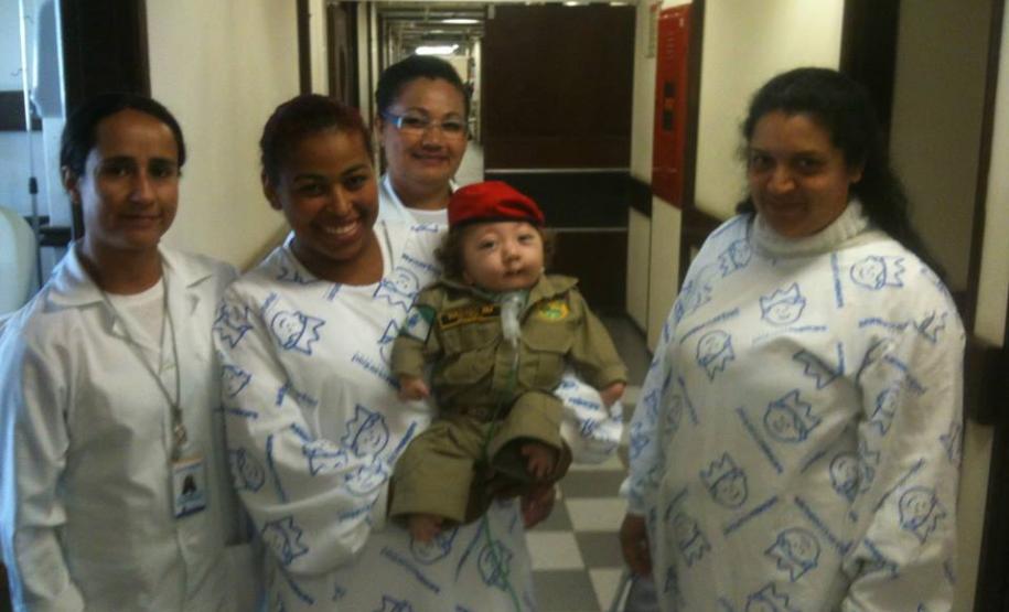 Soldado do Corpo de Bombeiros homenageia com farda mirim criança com síndrome rara no Hospital Pequeno Príncipe