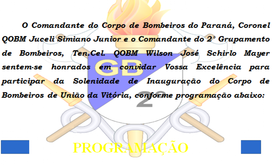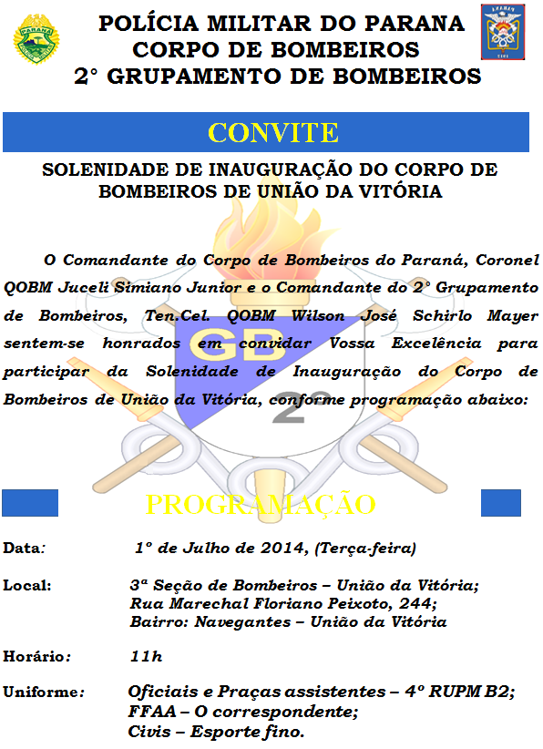 O Comandante do Corpo de Bombeiros, Coronel QOBM Juceli Simiano Junior e o Comandante do 2° Grupamento de Bombeiros, Ten.Cel. QOBM Wilson José Schirlo Mayer sentem-se honrados em convidar Vossa Excelência para participar da Solenidade de Inauguração do Corpo de Bombeiros de União da Vitória.