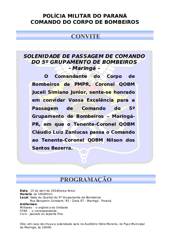 O Comandante do Corpo de Bombeiros da PMPR, Coronel QOBM Juceli Simiano Junior, sente-se honrado em convidar Vossa Excelência para a Passagem de Comando do 5º Grupamento de Bombeiros – Maringá- PR, em que o Tenente-Coronel QOBM Cláudio Luiz Zanlucas passa o Comando ao Tenente-Coronel QOBM Nilson dos Santos Bezerra.