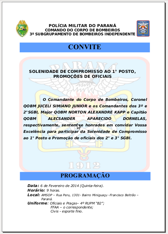 O Comandante do Corpo de Bombeiros, Coronel QOBM JUCELI SIMIANO JUNIOR e os Comandantes dos 3o e 2°SGBI, Major QOBM NORTON ALEXANDRE KAPP e Capitão QOBM ALECSANDER APARECIDO DORNELAS, respectivamente, sentem-se honrados em convidar Vossa Excelência para participar da Solenidade de Compromisso ao 1° Posto e Promoção de oficiais dos 2° e 3° SGBI.PROMOÇÕES DE OFICIAIS