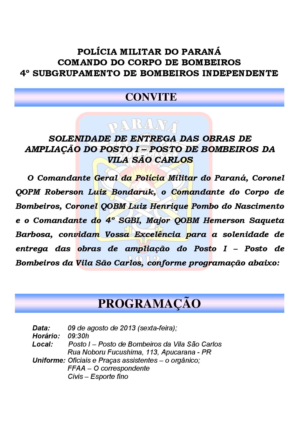É com grande satisfação que o Comandante Geral da Polícia Militar do Paraná, Coronel QOPM Roberson Luiz Bondaruk, o Comandante do Corpo de Bombeiros, Coronel QOBM Luiz Henrique Pombo do Nascimento e o Comandante do 4º SGBI, Major QOBM Hemerson Saqueta Barbosa, convidam a todos para participarem da solenidade de entrega de obras.
