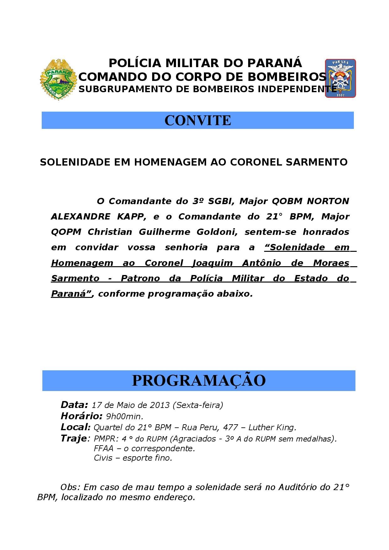 O Comandante do 3° Subgrupamento de Bombeiros Independente (3º SGBI), Major QOBM Norton Alexandre Kapp e o Comandante do 21° Batalhão de Polícia Militar (21º BPM), Major QOPM Christian Guilherme Goldoni, sentem-se honrados em convidar vossa senhoria para a “Solenidade em Homenagem ao Coronel Joaquim Antônio de Moraes Sarmento - Patrono da Polícia Militar do Estado do Paraná”, conforme programação abaixo.