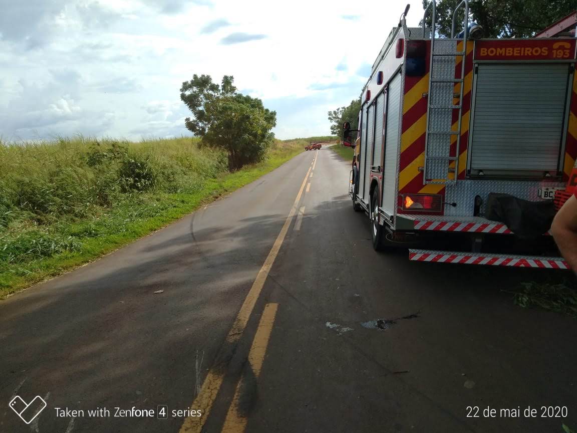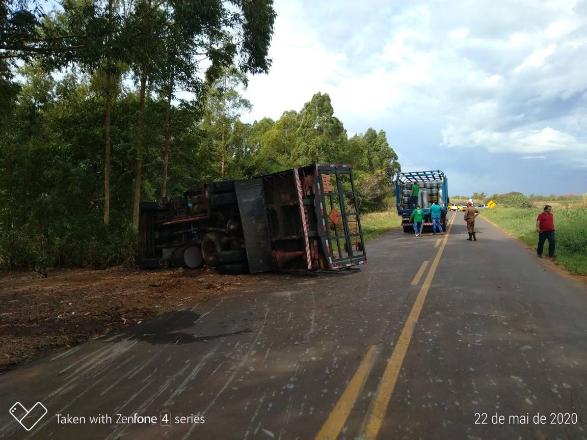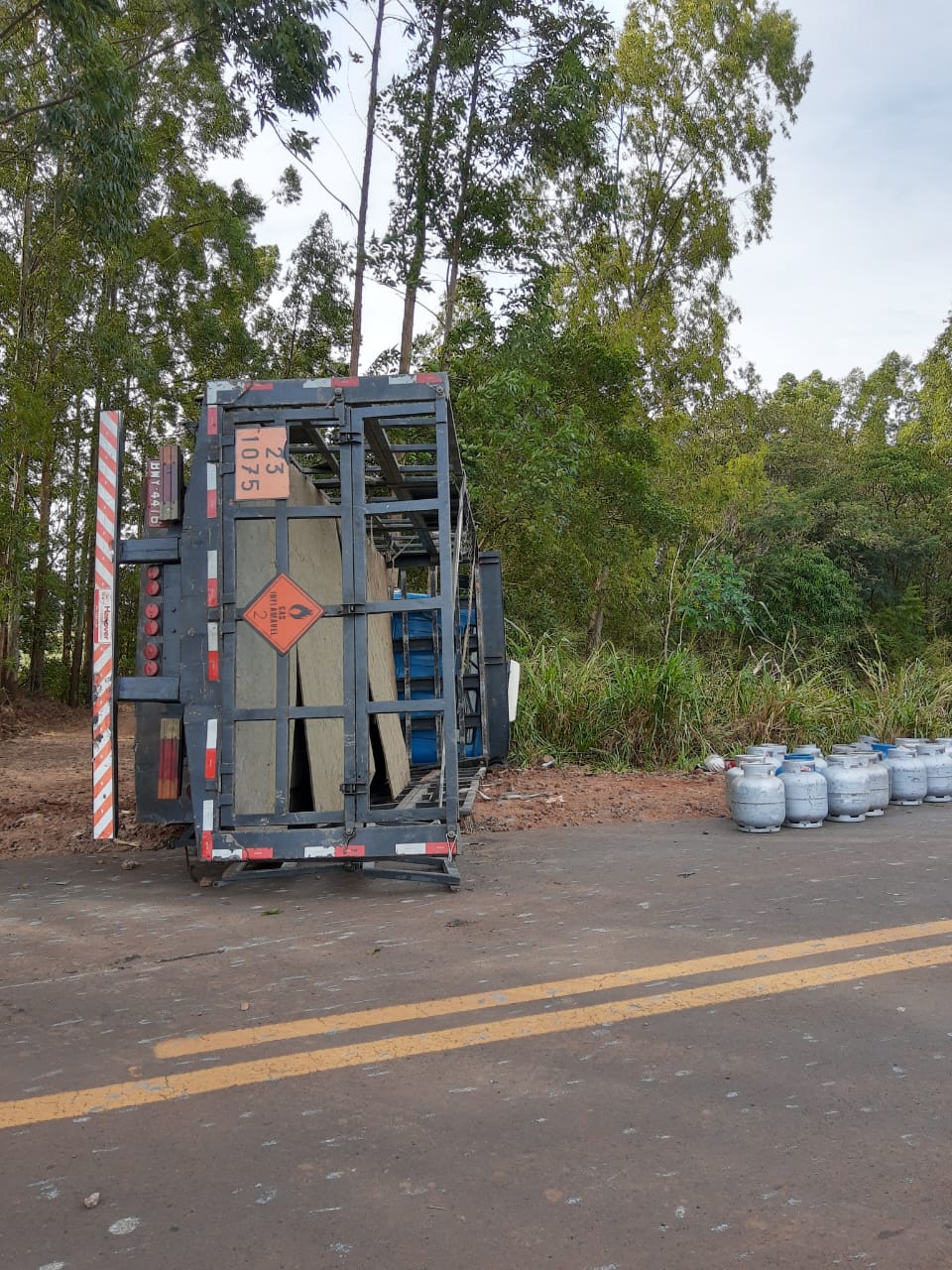 Maringá, 22/05/2020 – Na manhã (9h) desta sexta-feira (22), o Corpo de Bombeiros foi acionado para atendimento na PR 552, entre os municípios de Mandaguaçu e Ourizona, a um tombamento de caminhão carregado com botijões P13 de gás liquefeito de petróleo - GLP, com informação inicial de parte da carga vazando e dispersa na pista, havendo uma vítima andando pelo local. De imediato foram despachados um caminhão de resgate e uma ambulância do Corpo de Bombeiros, um veículo de intervenção rápida - VIR SIATE (suporte avançado de vida composto por médico, enfermeiro/a e bombeiro condutor) e também Oficial de Área para gestão da cena.