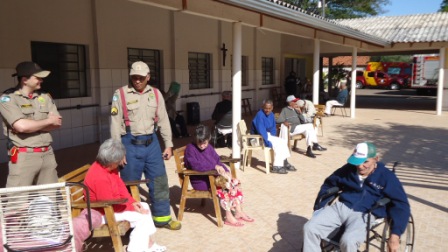Os militares deslocaram com as viaturas caminhão de Combate a Incêndios, Auto Ambulância e Auto Busca e Salvamento para demonstração dos materiais e equipamentos de resgate utilizados pelo Corpo de Bombeiros juntamente com a equipe de plantão até a sede do lar para idosos para fazer uma visita aos moradores proporcionando um momento diferenciado na vida daquelas pessoas.