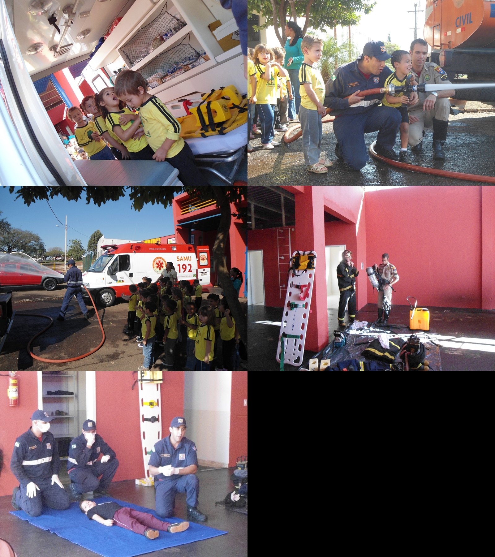 Foram demonstradas as viaturas e materiais às crianças, demonstrado como é realizado um atendimento Pré Hospitalar e como se utiliza o equipamento de Combate à Incêndio.