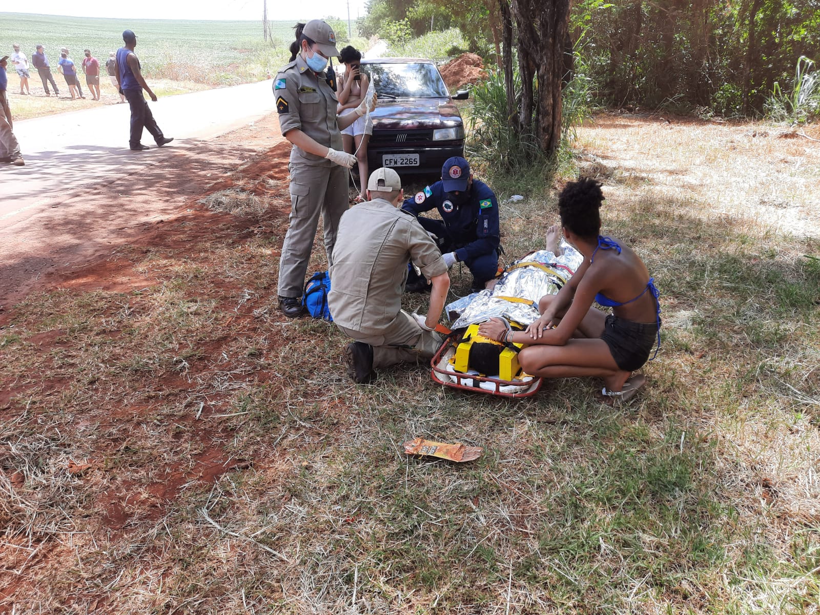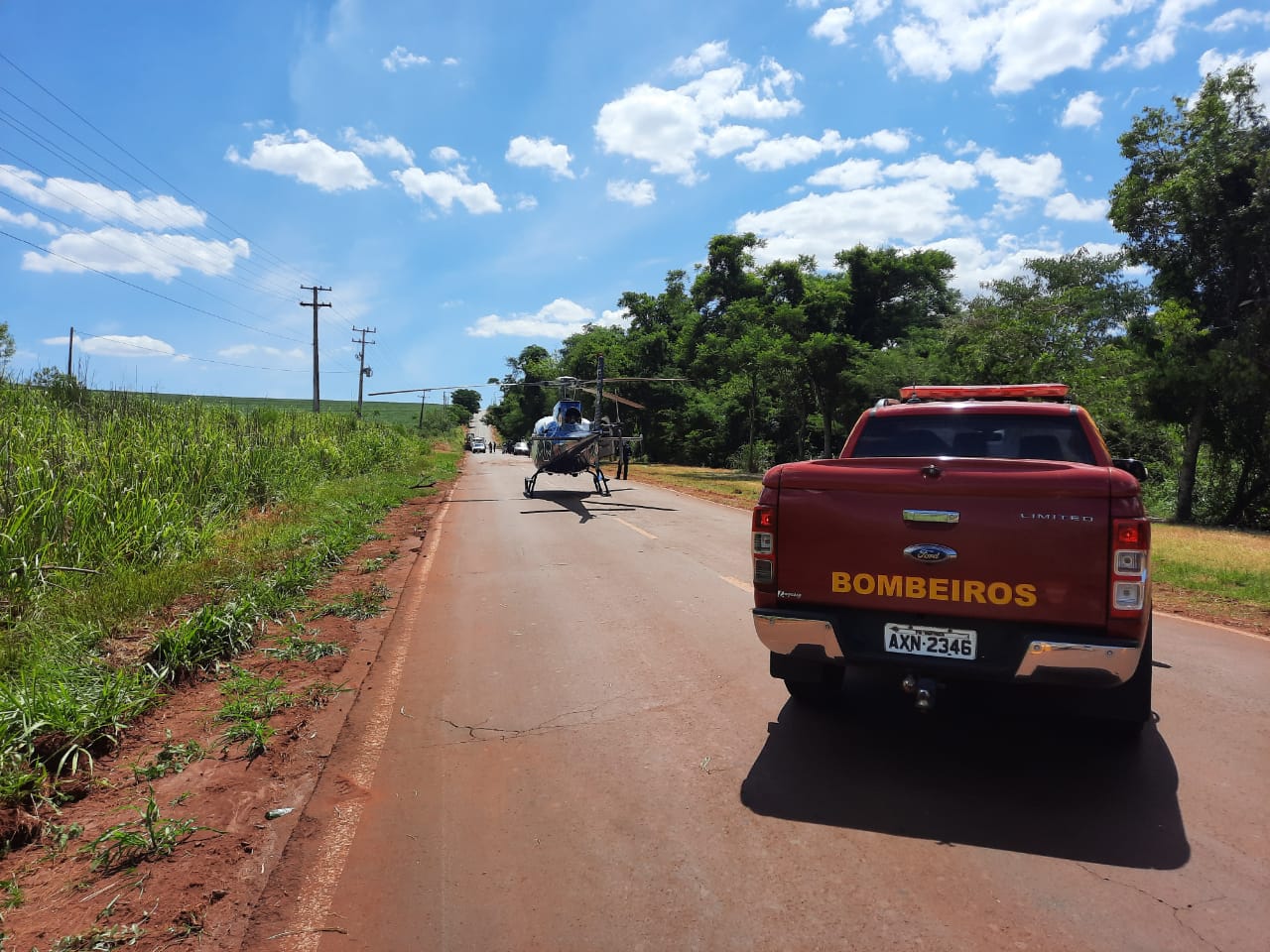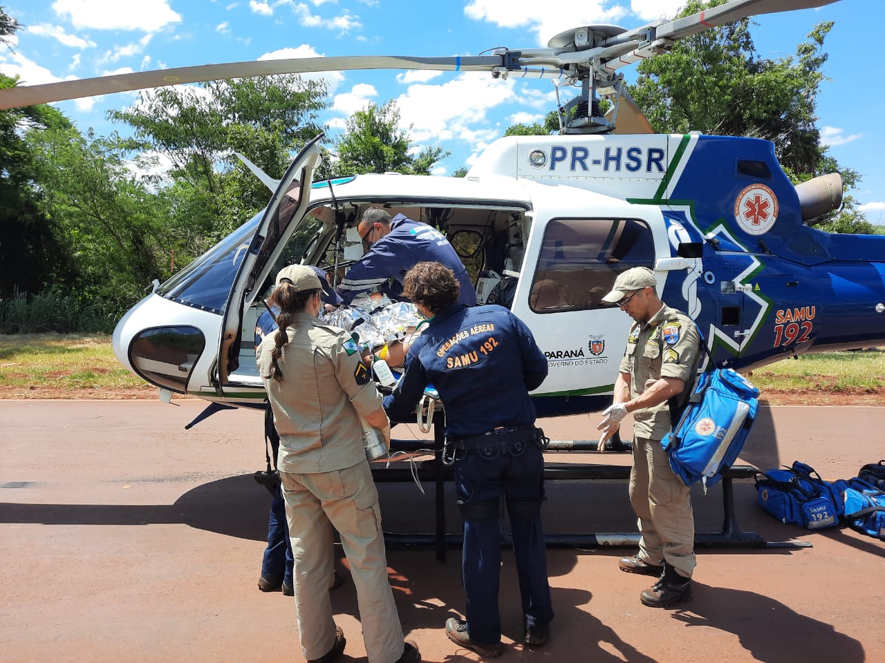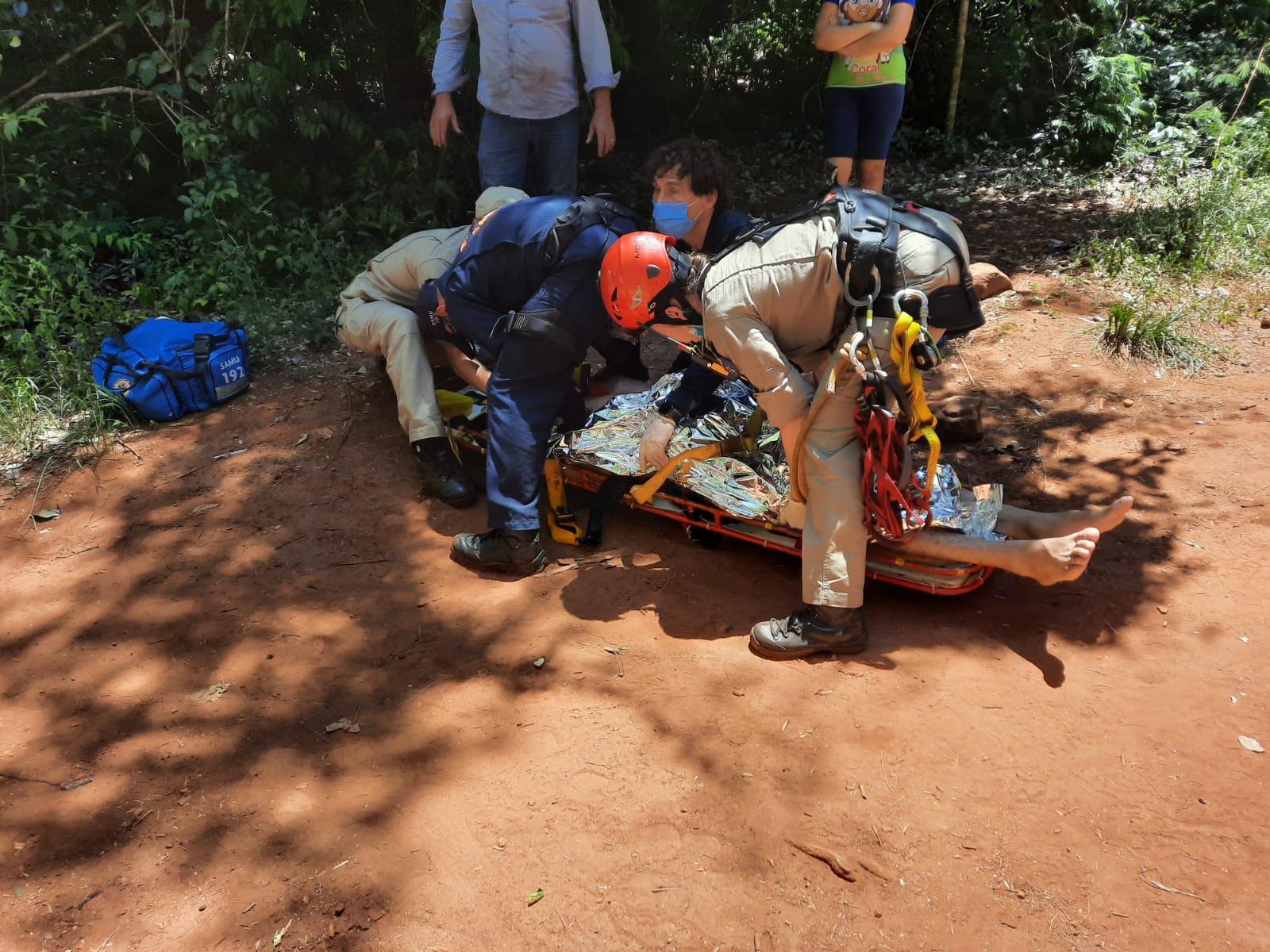 No local, a vítima já recebia atendimento pré-hospitalar do suporte avançado de vida do helicóptero Saúde 10 do SAMU. O Corpo de Bombeiros aplicou um recurso material denominado maca de resgate tipo ribanceira para conferir mais segurança no transporte até a aeronave.