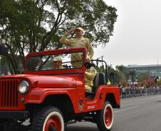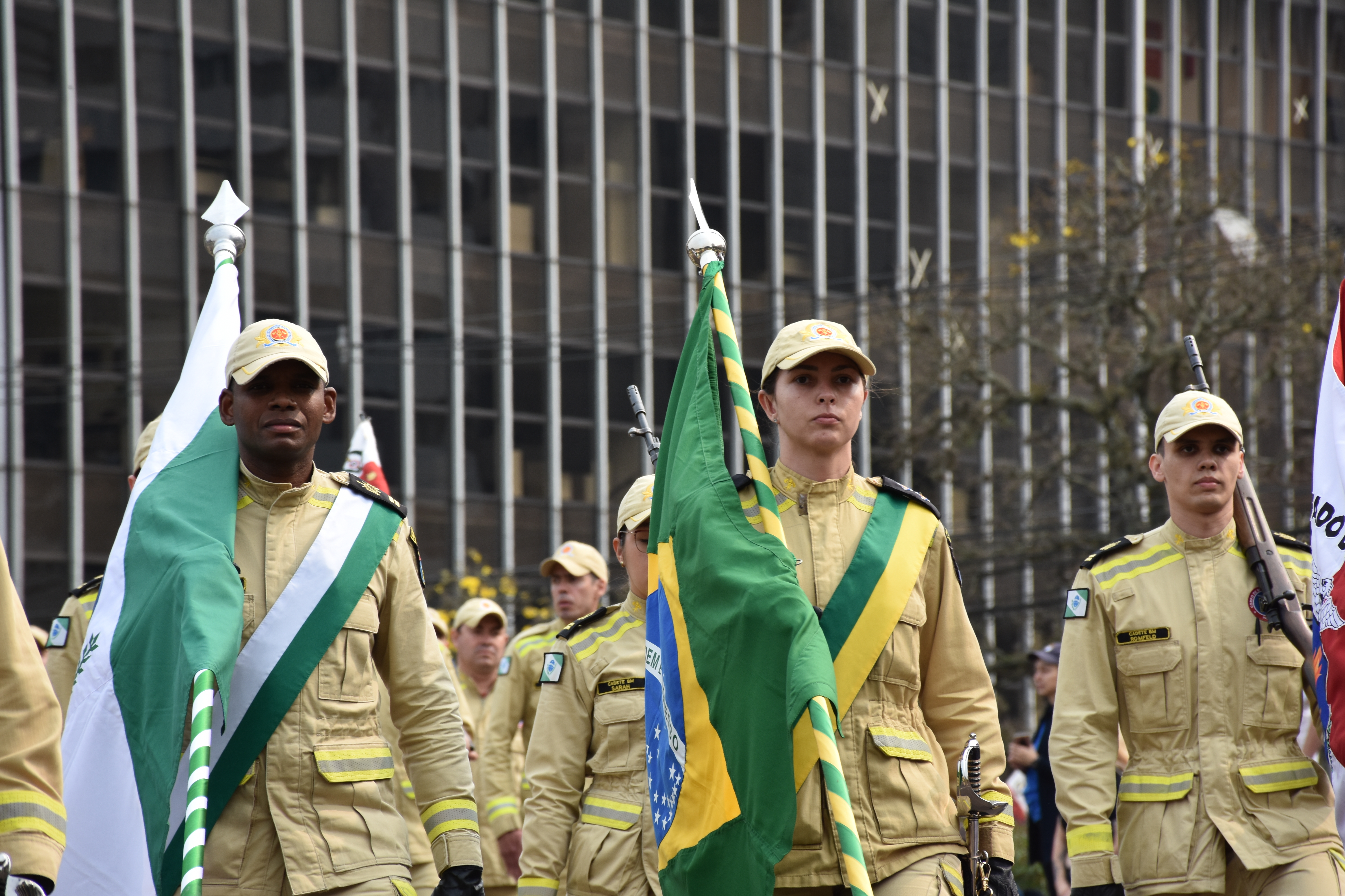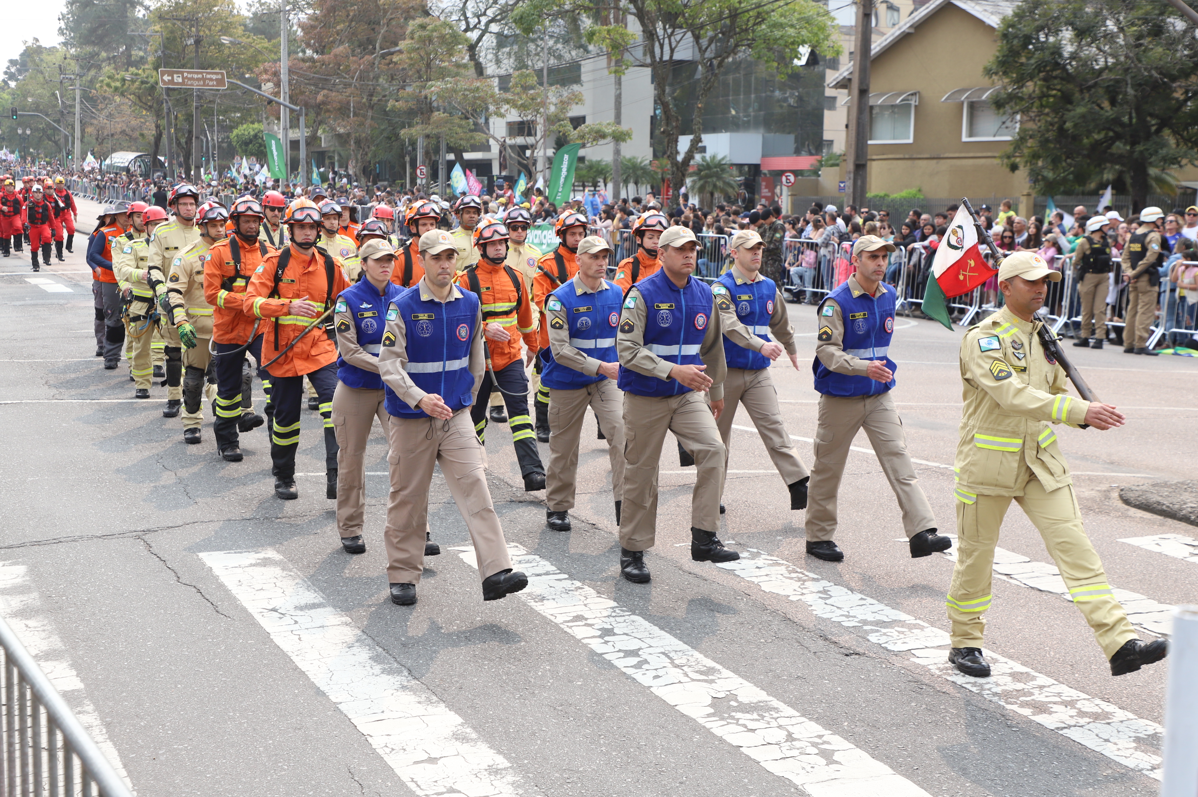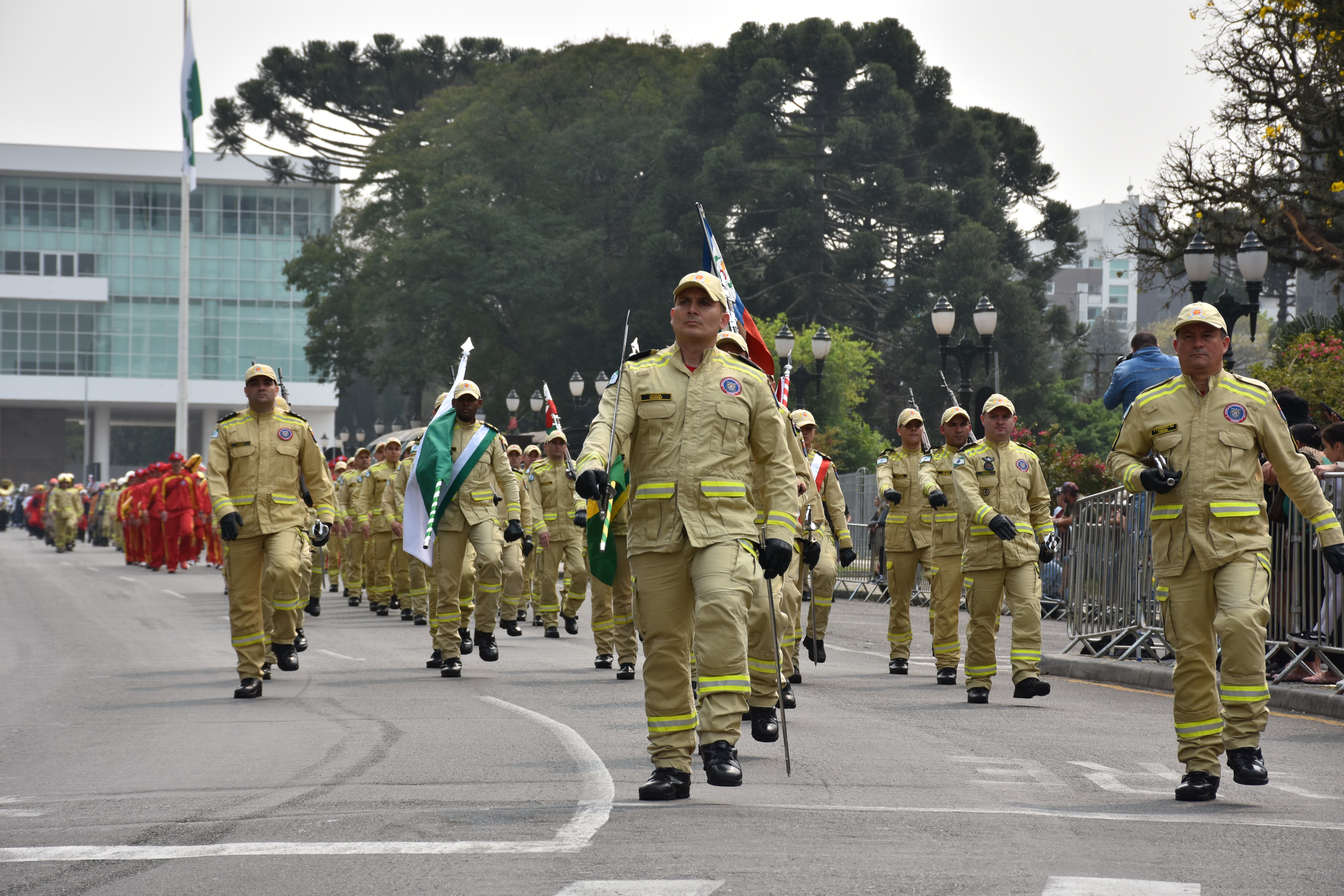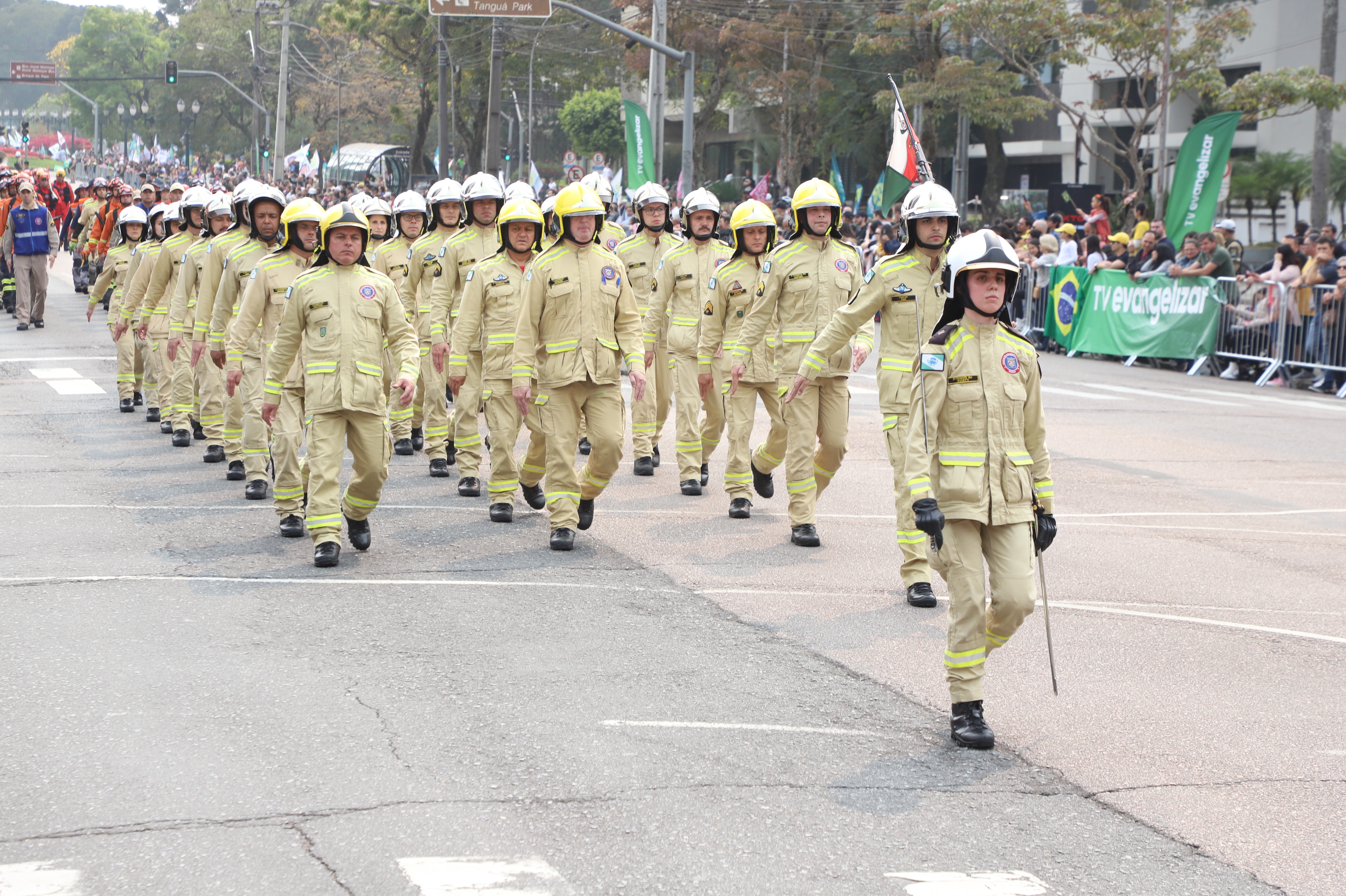 O desfile - Dando início à passagem do CBMPR, desfilaram o tenente-coronel Fernando Ferreira Machado, em uma viatura do Exército Brasileiro, e o tenente-coronel Leandro Zotelli de Mattos, completando o trajeto a pé. Os cerca de 3,3 mil bombeiros militares do Paraná foram então representados na capital por cinco pelotões, sob o comando do major Rafael Cosme Pierozan Tavares.