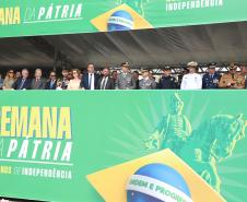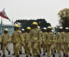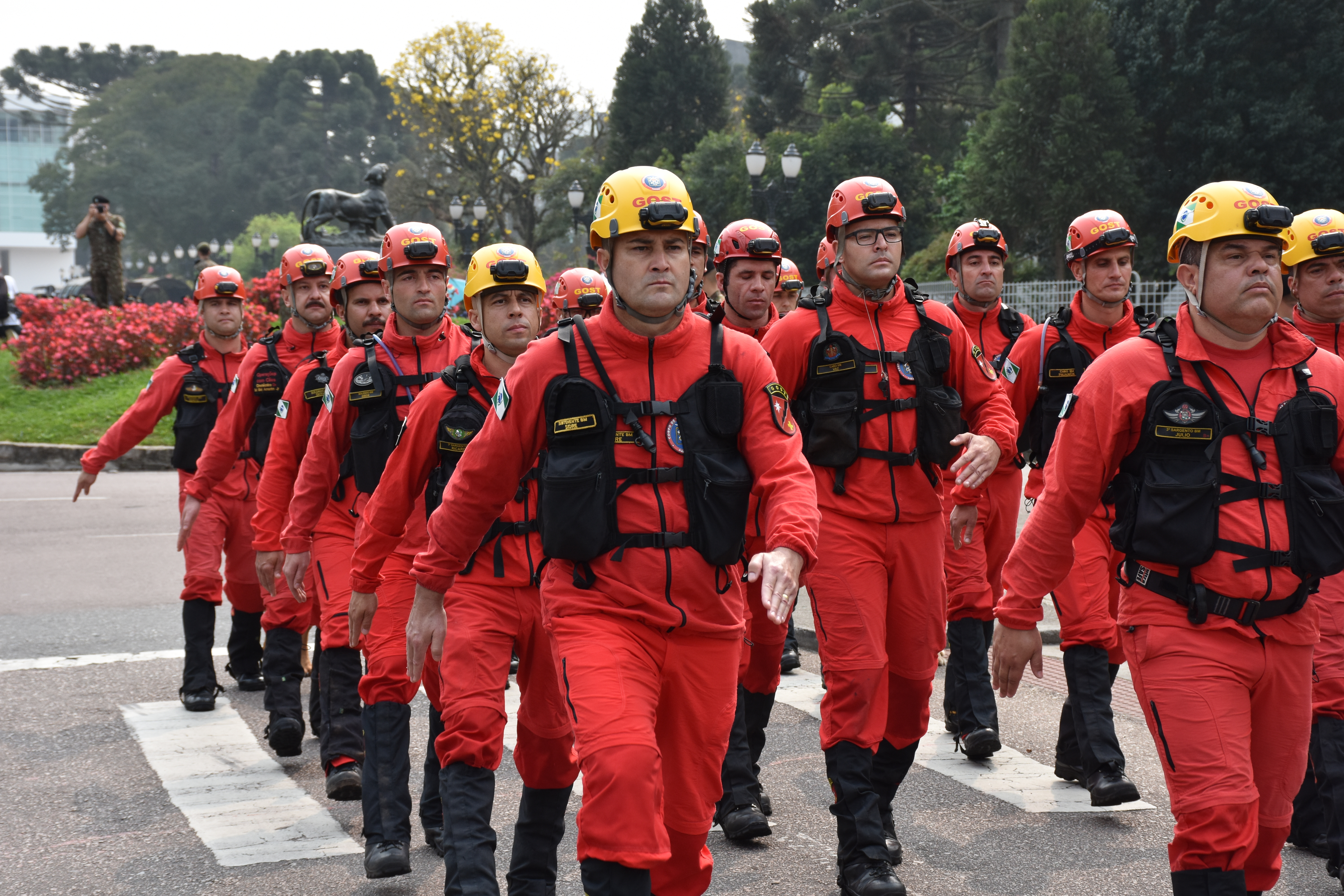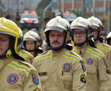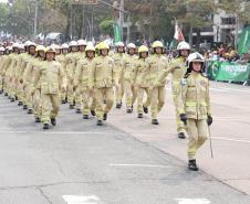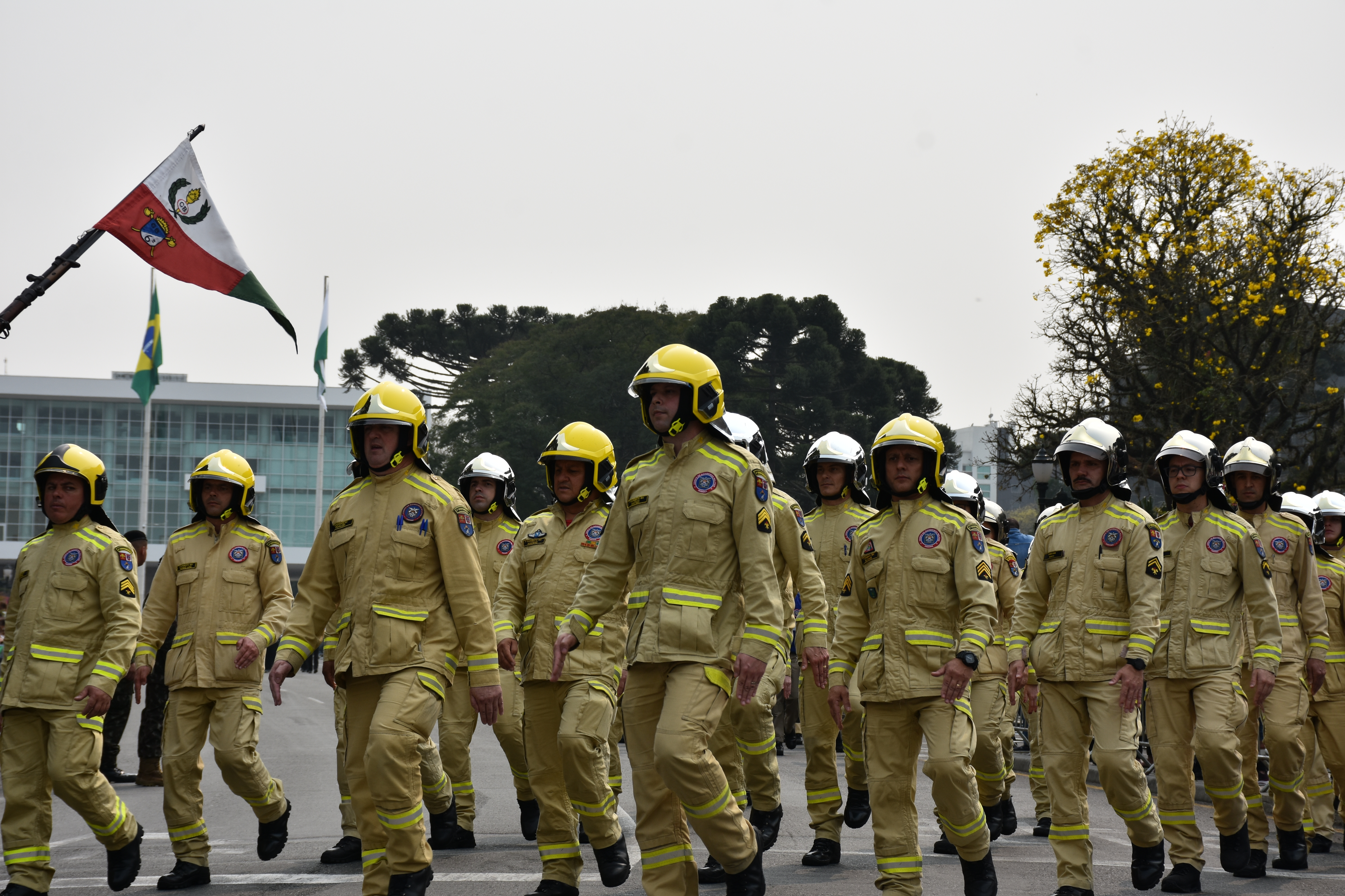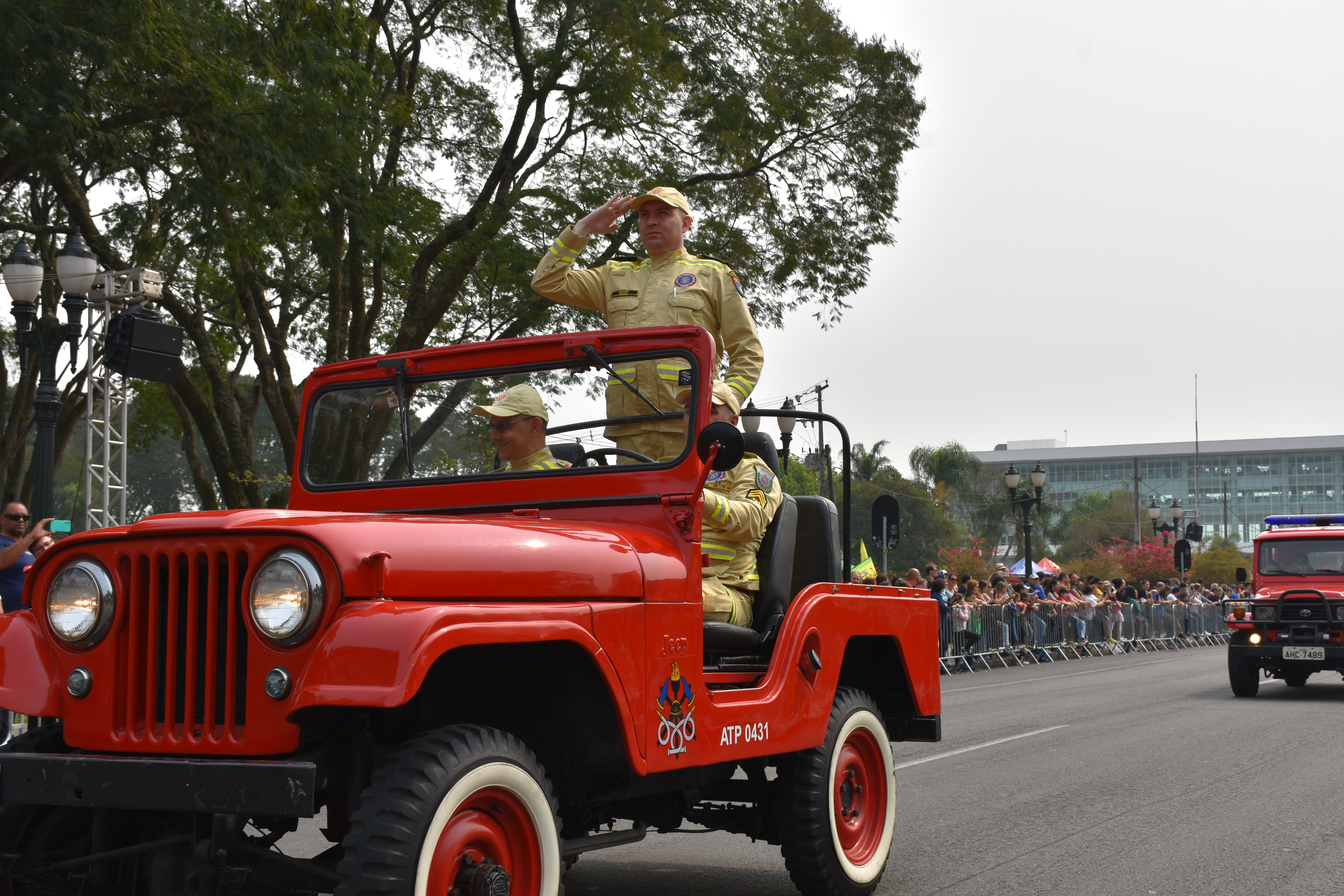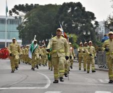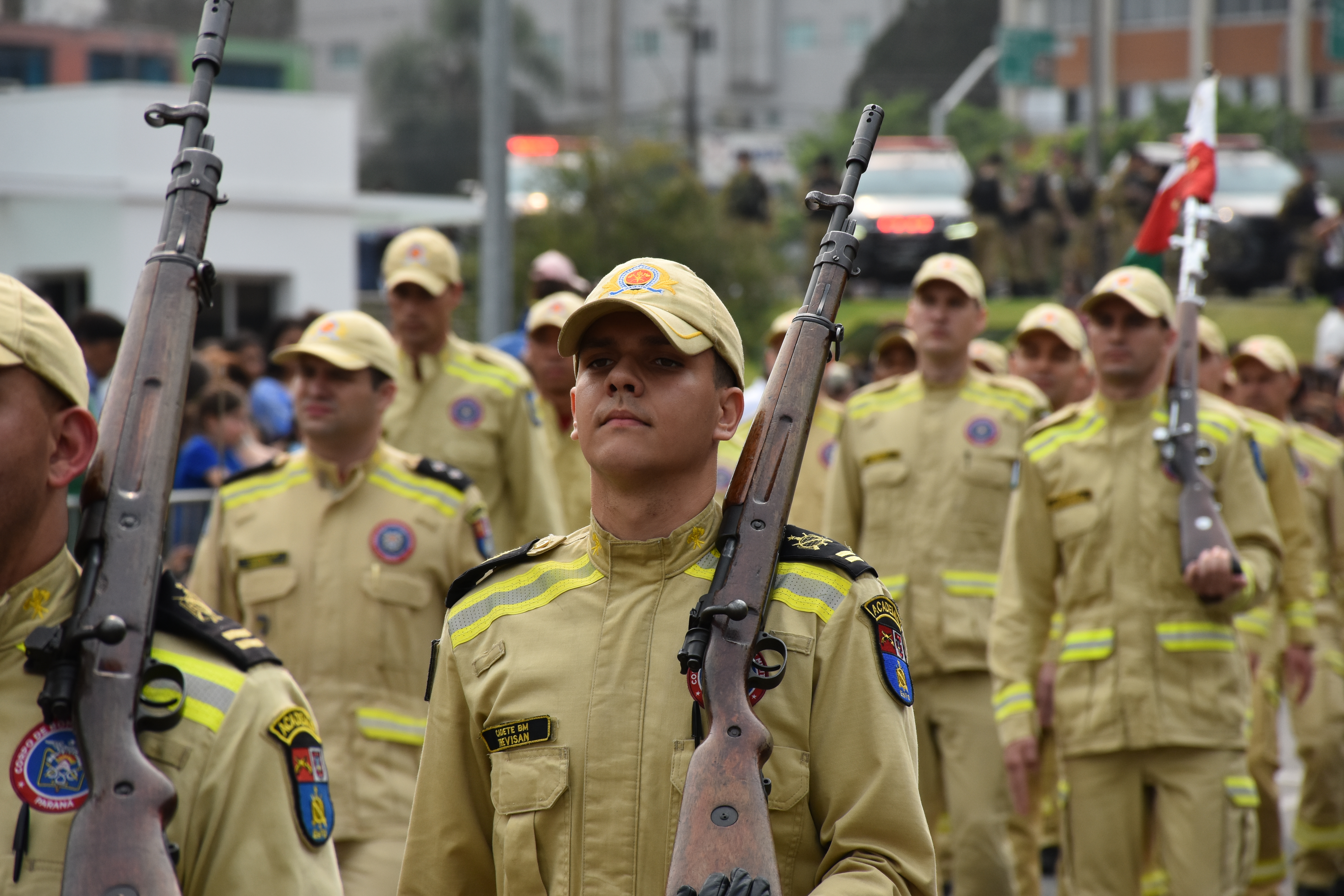 O desfile - Dando início à passagem do CBMPR, desfilaram o tenente-coronel Fernando Ferreira Machado, em uma viatura do Exército Brasileiro, e o tenente-coronel Leandro Zotelli de Mattos, completando o trajeto a pé. Os cerca de 3,3 mil bombeiros militares do Paraná foram então representados na capital por cinco pelotões, sob o comando do major Rafael Cosme Pierozan Tavares.